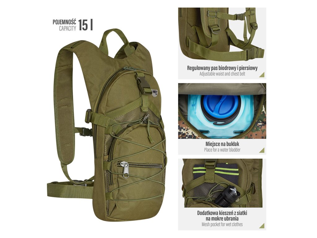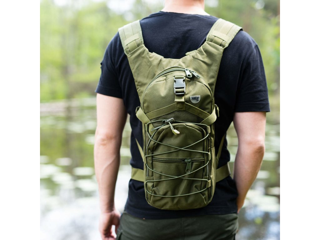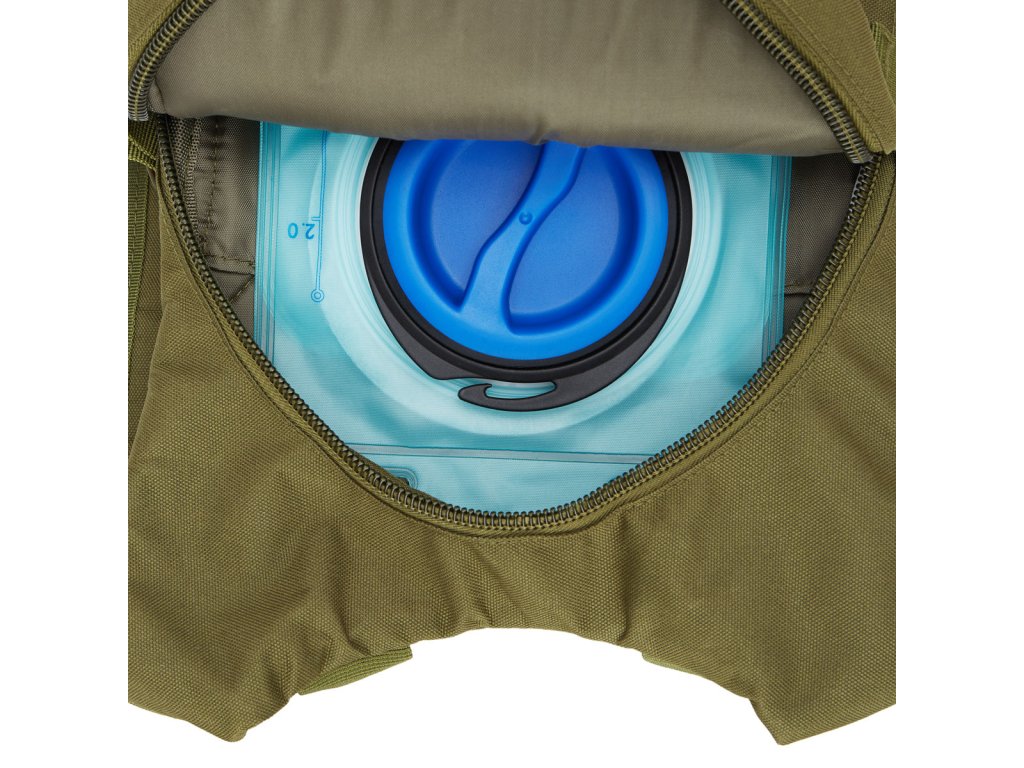 Hlavní komora batohu je opatřena přepážkou, v horní části se nachází 2 karabiny pro zavěšení hydrovaku (není součástí dodávky). Hadičku hydrovaku lze vyvést průvlaky na pravé i na levé straně pod ramenními panely. Na hlavní komoře se nacházejí další úložné prostory a to velká síťovaná kapsa s popruhem a přezkou - menší otevřená, síťovaná kapsa - 2. komora na zip - kapsa na zip (například pro mobilní telefon a peněženku) a gumová šňůra s brzdičkou, pod kterou lze přenášet například cyklistickou helmu, nebo karimatku. Po stranách batohu se nachází kompresní popruhy, které stahují hlavní komoru a obě síťované kapsy. Na horní straně je robustní ucho pro pohodlné přenášení batohu v ruce. Zadní strana a ramenní popruhy jsou polyesterové bez polstrování. Na popruzích je gumové poutko k provlečení hadičky hydrovaku a hrudní popruh, ten je výškově a délkově nastavitelný. Bederní popruh s robustní přezkou má šířku 3,5 centimetru.