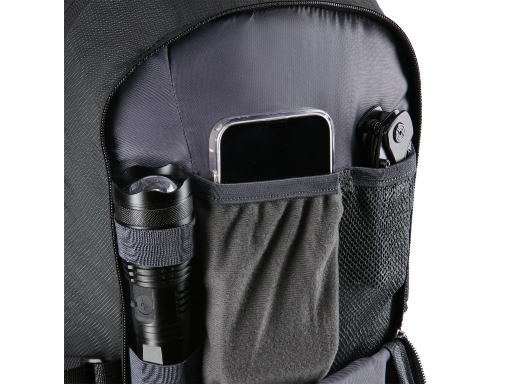 Hlavní komora na dvoucestný zip je opatřena kapsou na hydrovak, který lze zavěsit na řemínek se suchým zipem. Druhá, menší komora je také opatřena dvoucestným zipem a uvnitř se nachází 2 kapsy na drobnosti a 3 poutka například pro umístění svítilny. V horní části předního panelu se nachází menší kapsa, do které se přistupuje jednocestným zipem. Po stranách batohu jsou síťované kapsy s gumičkou v lemu, nad kapsami se nachází délkově nastavitelné popruhy s přezkou, pod které lze umístit například vyšší láhev. Z čela batohu se nachází 2 gumová poutka a 2 smyčky pro přenášení turistických holí, 4 poutka pro zavěšení například kempingového vybavení a poutko pro připevnění blikačky pro zvýšení viditelnosti za šera.