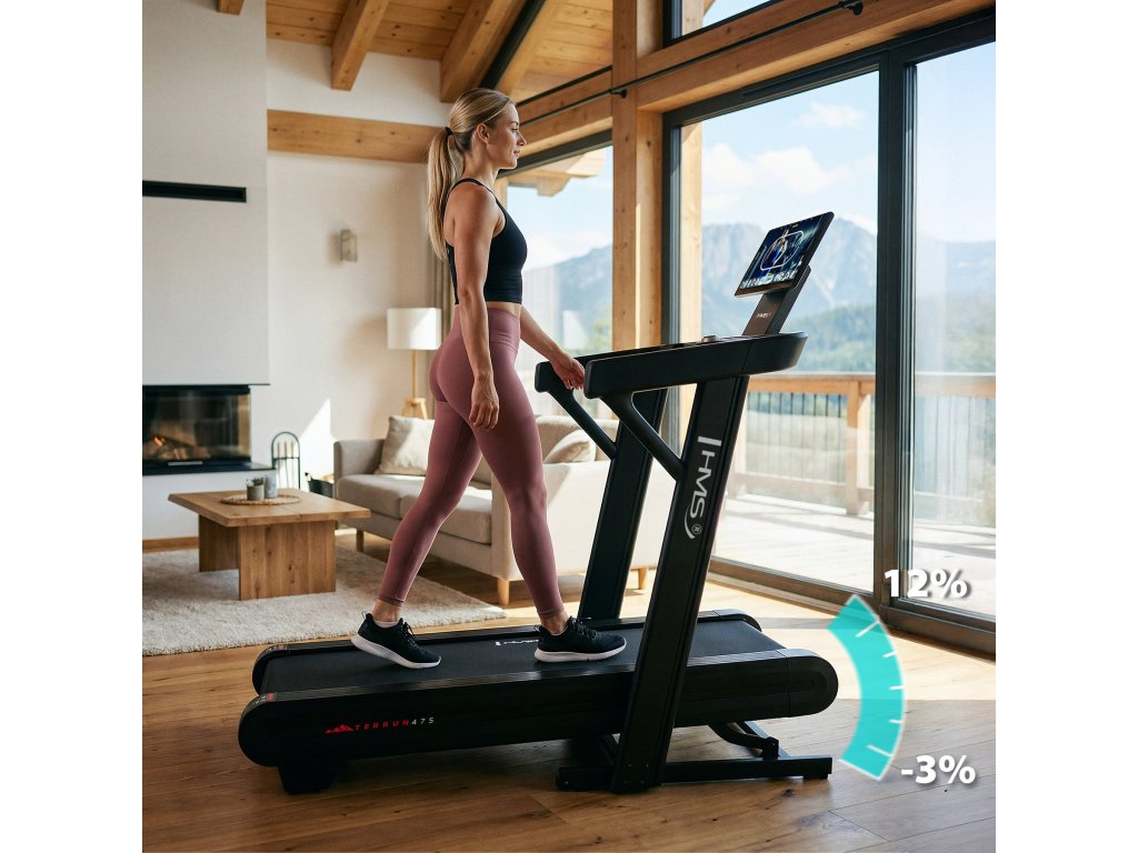 Běžecký pás TERRUN475 disponuje obousměrným sklonem v rozsahu od -3 % do 12 %, který umožňuje realistickou simulaci seběhů i prudkých výběhů. Trénink tak připomíná běh v horách nebo na členitých lesních stezkách a intenzivně zapojuje svaly nohou, hýždí i středu těla (core).