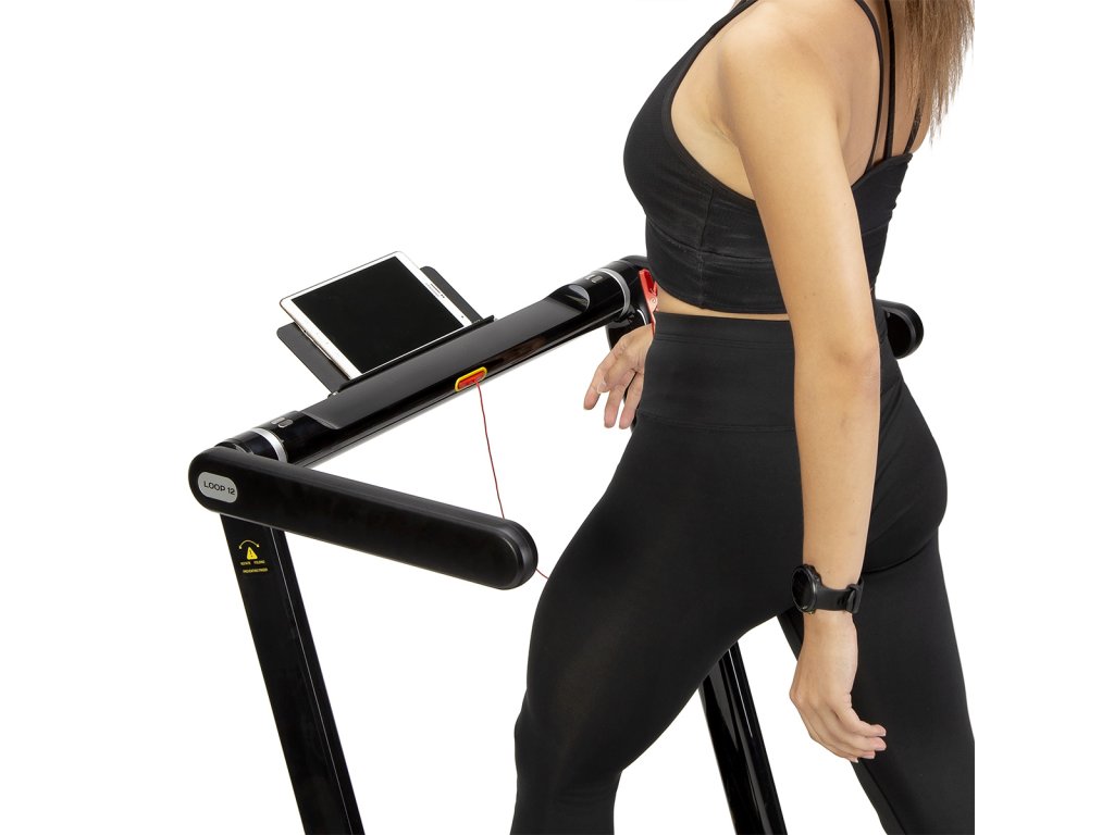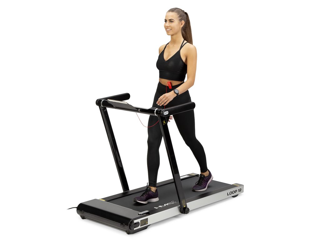 Maximální rychlost trenažéru je 12 km/h, motor má špičkový výkon 2,5 HP. Běžecká plocha o rozměrech 125 x 45 cm je na 6 místech odpružena pomocí silikagelových silentbloků, které snižují zatěžování kloubů při běhu. Konzole jde snadno sklopit k zadní hraně trenažéru a po sklopení získáme rozměr 158 x 77 x 14 cm a trenažér se tak vejde za skříň, nebo pod postel. Přesouvání modelu LOOP12 navíc ulehčují 2 páry koleček. První pár se nachází na spodní hraně a po zvednutí zadní části pásu umožňují pohyb vpřed a vzad. Druhý pár koleček se nachází na čele trenažéru a po jeho zvednutí do svislé polohy umožňují pohyb do stran.