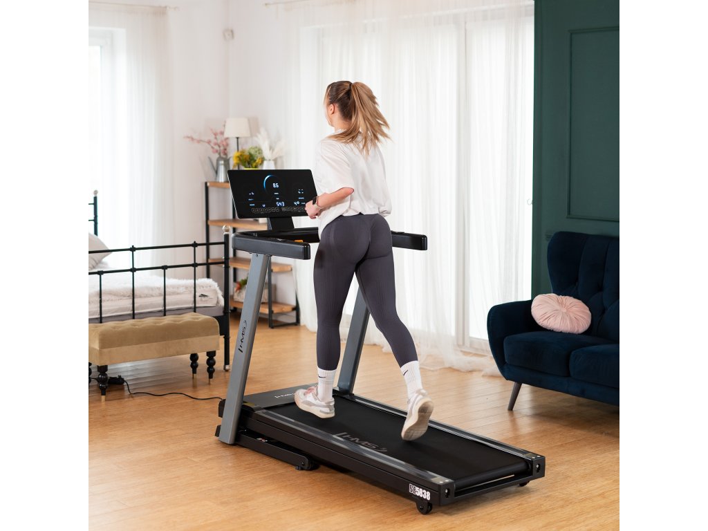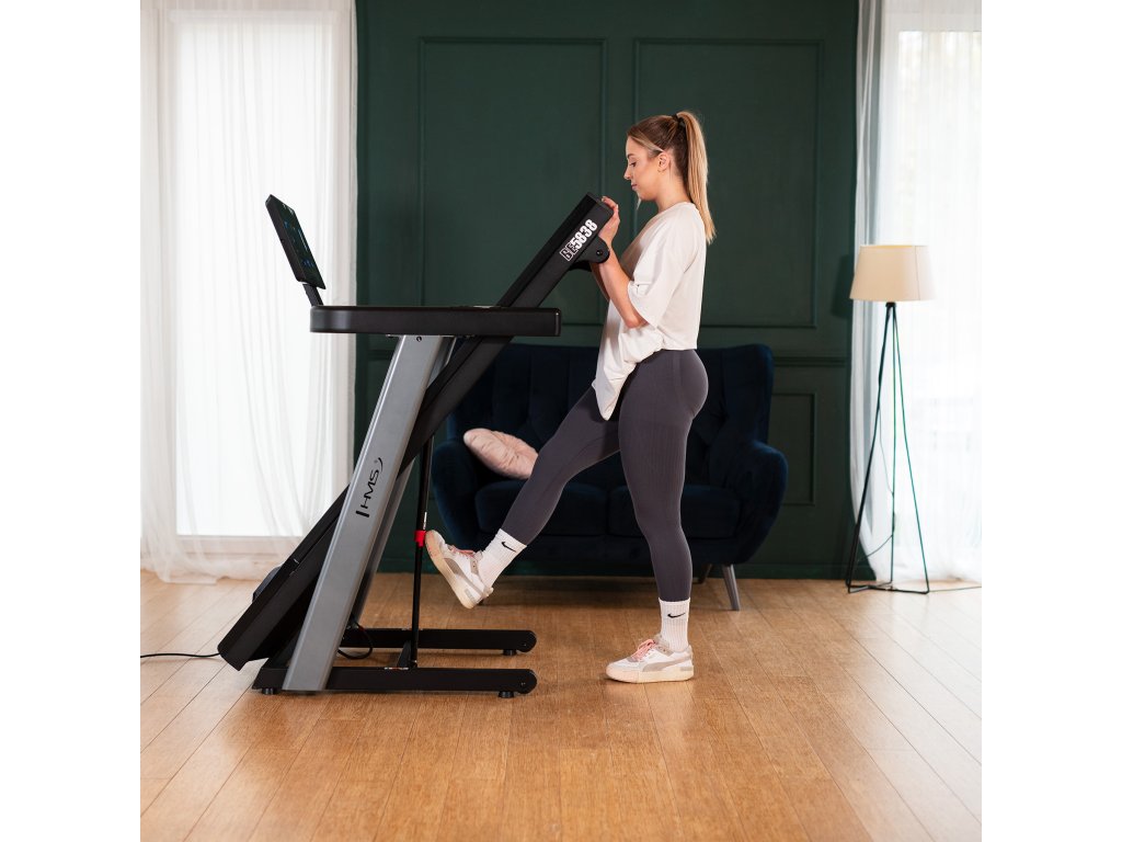 Trenažér má velkorysou běžeckou plochu o rozměrech 142 x 50 cm a pokročilý systém odpružení sestávající ze 6 vnitřních silentbloků, které minimalizují namáhání kloubů a zvyšují pohodlí při dlouhém tréninku. Díky funkci Soft Drop se běžecká plocha snadno zvedá a plynule spouští pro úsporu místa a zařízení se snadno přemisťuje a skladuje díky transportním kolečkům. Ve složeném stavu zabírá běžecký pás méně místa, což z něj činí praktické řešení.