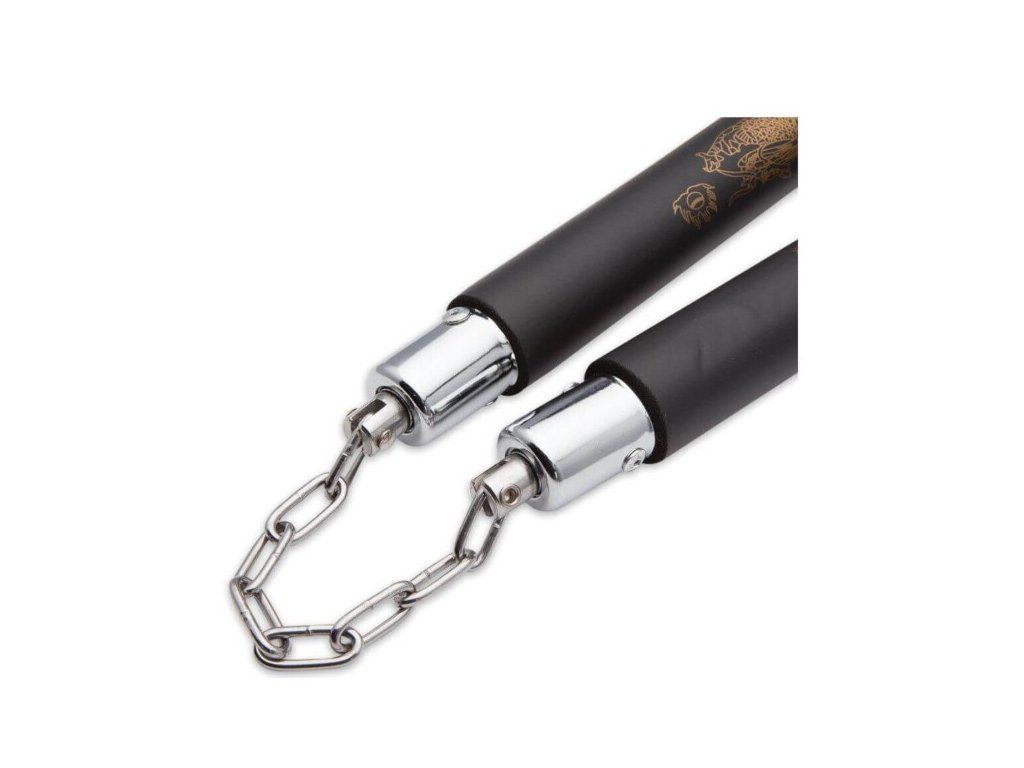 Nunchaku, neboli nunčaky DBX BUSHIDO ARW-5049 jsou díky pěnovým rukojetím vhodné k tréninku bojových umění. Vysoká vrstva pěny snižuje riziko zranění. Ocelové válečky jsou opatřeny ložisky a spojeny svařovaným řetězem.