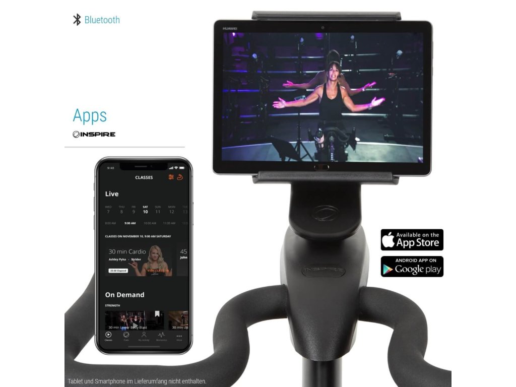 Aplikace Inspire Fitness přináší kurzy cyklistiky, které si můžete vychutnat z pohodlí vašeho domova. Aplikaci Inspire Fitness snadno a rychle nainstaujete do vašeho tabletu nebo smartphonu. Jednoduše naskenujte QR kód umístěný na držáku tabletu a postupujte podle pokynů na vašem mobilním zařízení. K dipozici je více než 150 různých workoutů a další denně přibývají! Aplikace vám na první pohled zobrazí všechna důležitá tréninková data a spojí vás s profesionálními trenéry, kteří vás motivují a povzbuzují v průběhu vašeho tréninku! Zažijte kurzy cyklistiky stejně jako v tělocvičně, přitom ale v pohodlí svého domova, kdykoli budete chtít.