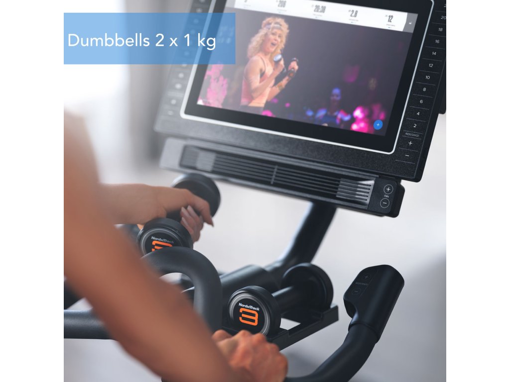 Gelové sedlo je ergonomicky tvarované a je jednoduše nastavitelné jak ve vertikální, tak i v horizontální poloze, včetně jeho sklonu. Protiskluzová řidítka jsou výškově i horizontálně nastavitelná a umožňují vícepolohový úchop. Pitný režim dodržíte i během jízdy, držáky na lahev jsou umístěné pod řidítky. Dalším bonusem trenažeru NordicTrack Commercial S15i jsou činky jednoručky, každá o hmotnosti 1 kg. Ani horní polovina těla tak nezůstane bez tréninku.