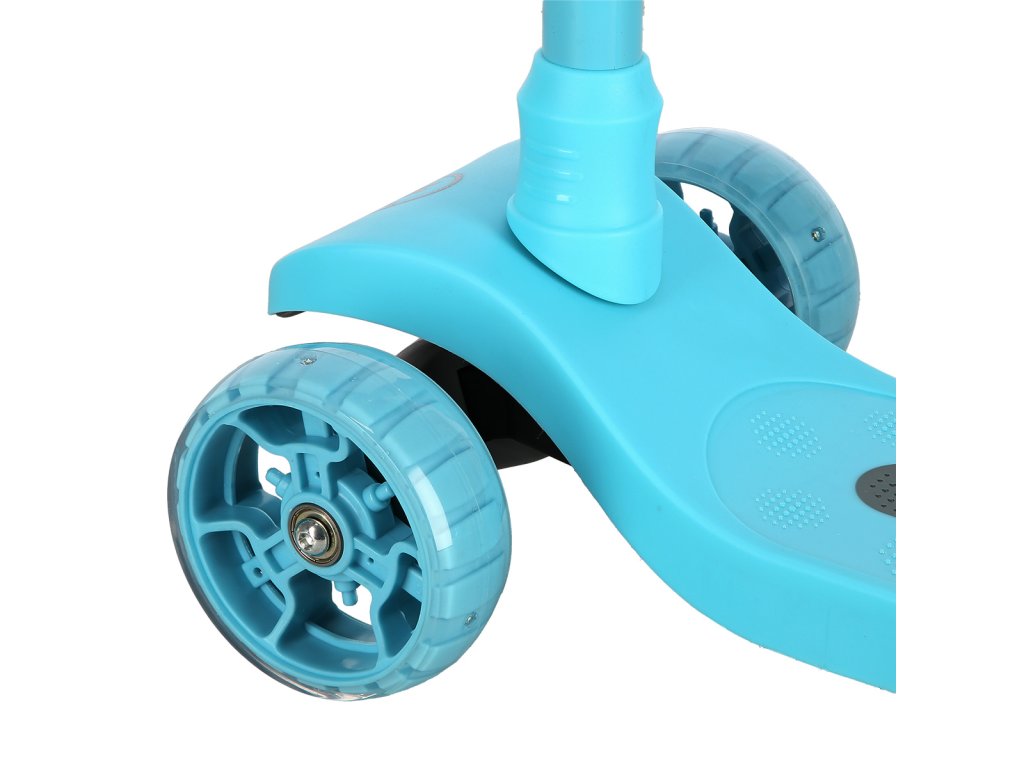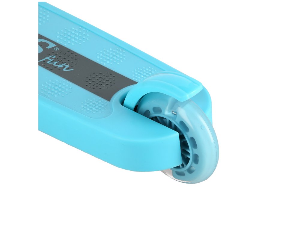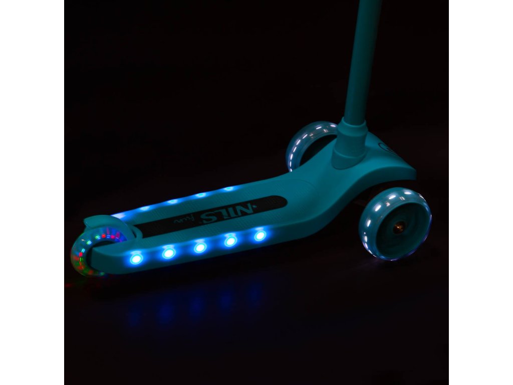 Přední kolečka o průměru 120 milimetrů jsou osazena bílími LED diodami, zadní kolečko o průměru 90 milimetrů diodami barevnými. Svítící LED diody slouží jako zajímavý, vizuální prvek, zvyšují zájem dětí a v neposlední řadě zvyšují viditelnost koloběžky například za šera. Kolečka svítí automaticky během jejich otáčení. Dále jsou kolečka osazeny ložisky ABEC 7 pro plynulou jízdu. Zadní blatník slouží jako nášlapná brzda pro bezpečné zastavení koloběžky.