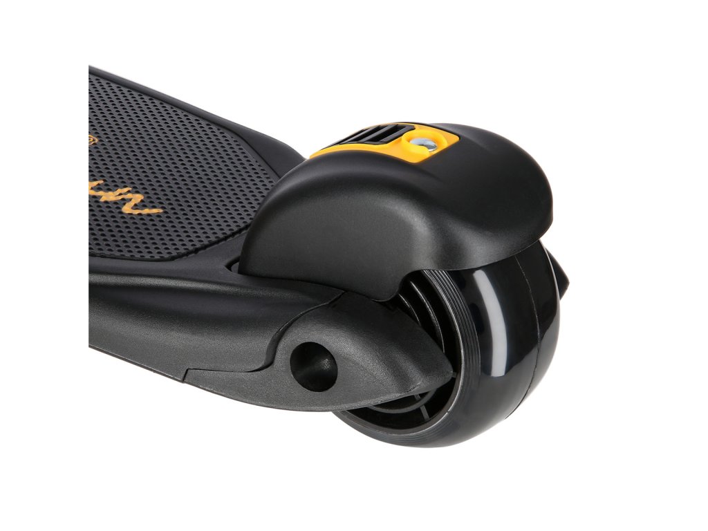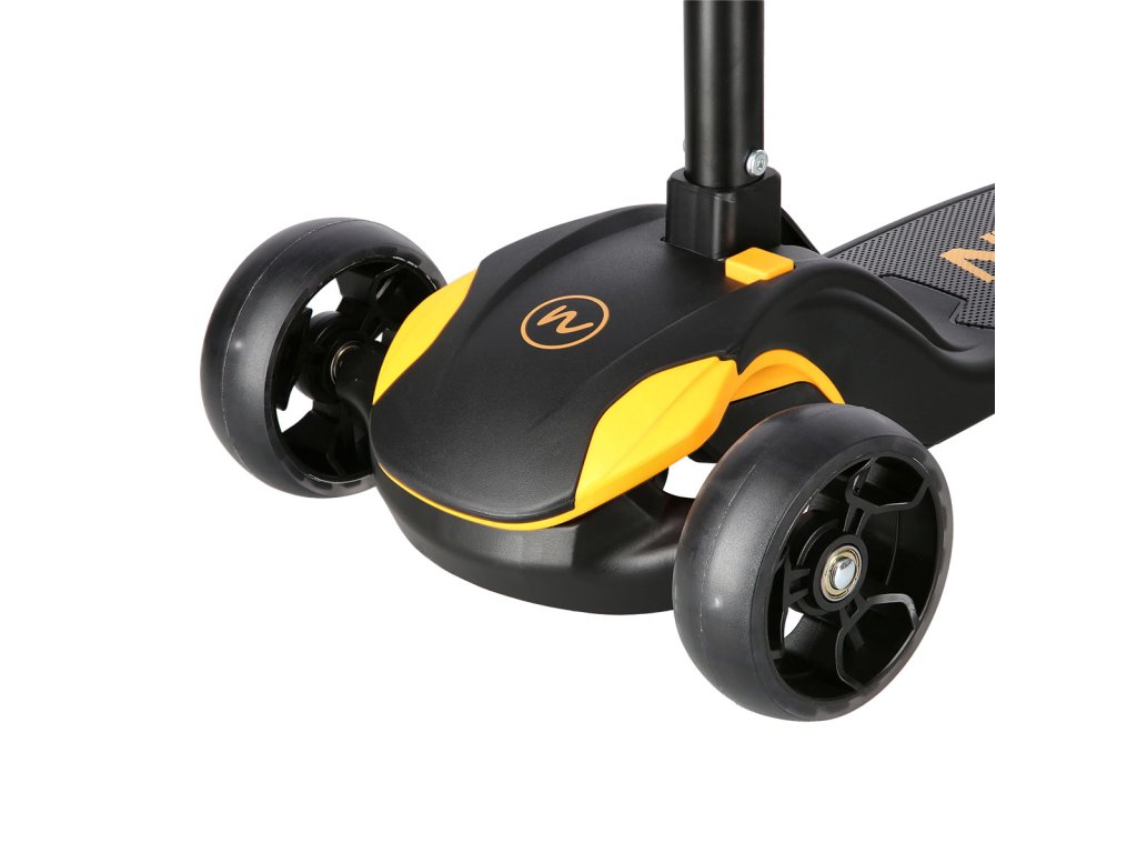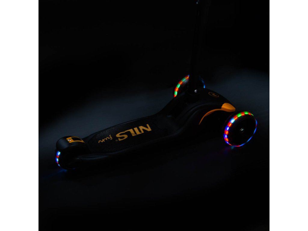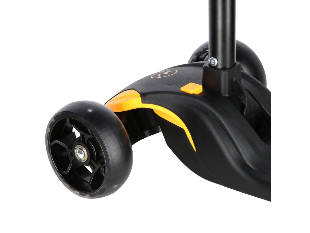 Přední kolečka jsou široká 40 milimetrů a zadní kolečko má šířku 50 milimetrů. Kolečka jsou osazeny ložisky ABEC 7 pro plynulou jízdu a navíc jsou vybavena svítícími LED diodami, které slouží jako zajímavý, vizuální prvek, zvyšují zájem dětí a v neposlední řadě zvyšují viditelnost koloběžky například za šera. Kolečka svítí automaticky během jejich otáčení. Zadní blatník slouží jako nášlapná brzda pro bezpečné zastavení koloběžky.