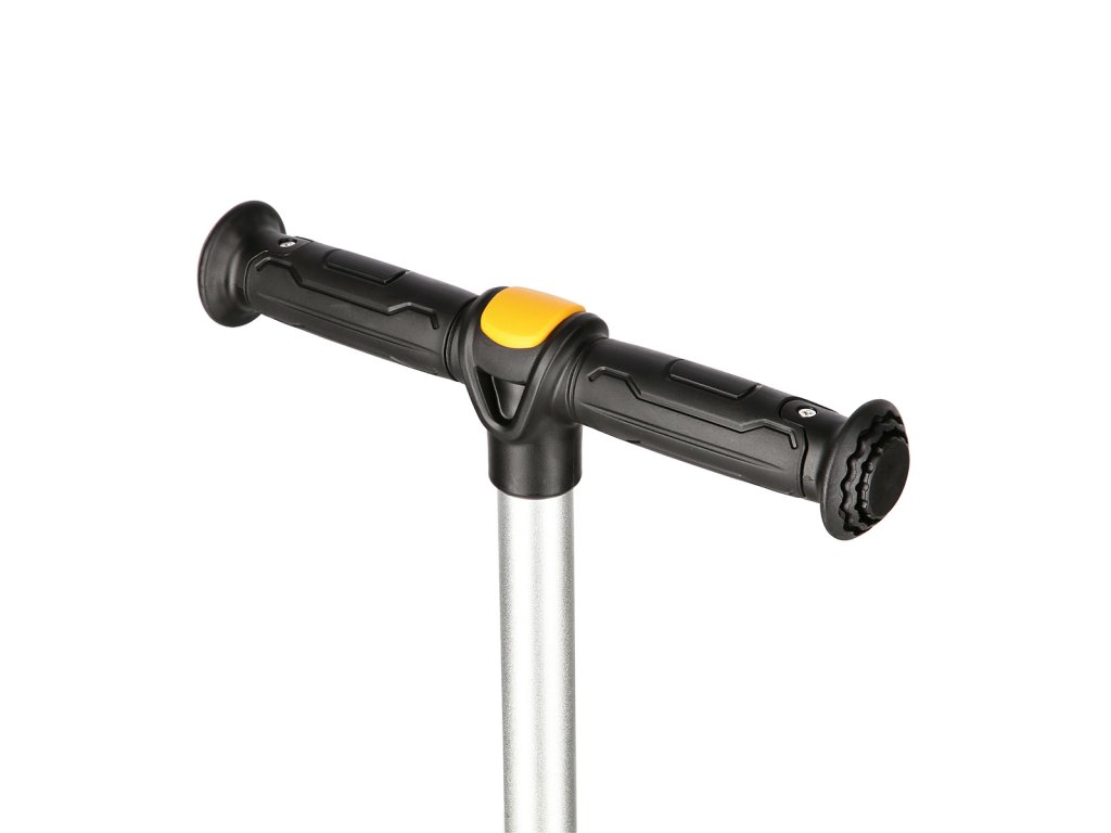 Teleskopická řídítka jsou výškově nastavitelná do 4 poloh (63 - 68 - 73 - 78 cm od země a 57 - 62 - 67 - 72 cm od stupátka). Změna nastavení výšky se provádí uvolněním páčky na robustní objímce, stisknutím pojistného čepu a vysunutím, nebo zasunutím vnitřní tyče řídítek. Pro úsporu místa lze řídítka sklopit - k tomu je potřeba stisknout tlačítko vedle řídítek a samotná řídítka pak povysunout nahoru. Tento systém sklápění je maximálně bezpečný a nemůže dojít k nechtěnému sklopení během jízdy. Gripy na řídítkách jsou vyrobeny z plastu s drážkováním pro pevný úchop. Konce gripů jsou opatřeny "kloboučkem", který zamezuje sesmyknutí dlaně z gripu a zároveň dlaň chrání, když dítě náhodou zavadí řídítkem o překážku - například o fasádu domu, nebo o sloupek dopravní značky. Šířka řídítek je 26 centimetrů a jejich užitná šířka (prostor pro ruce) je 23 centimetrů.