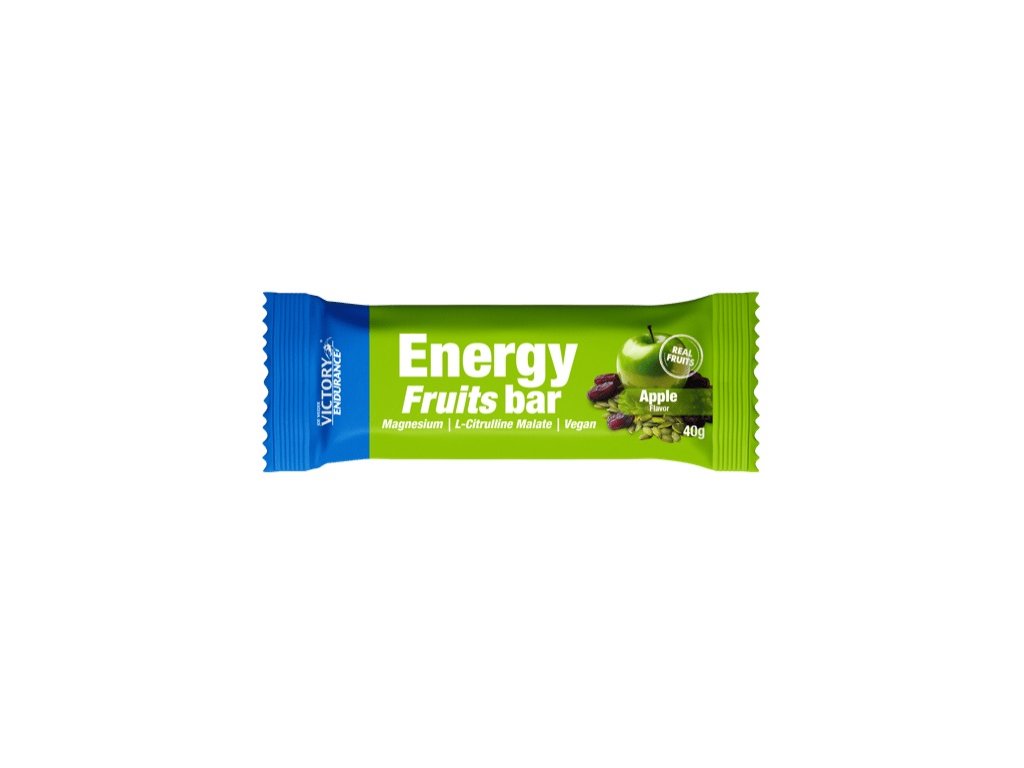 Energy Fruits bar: doplněk stravy. Ovocná energetická tyčinka obsahující L-citrullin, hořčík a vápník. Doplněk nenahrazuje vyváženou a různorodou stravu, která je pro správné fungování organismu nezbytně důležitá. Nepodávejte malým dětem.