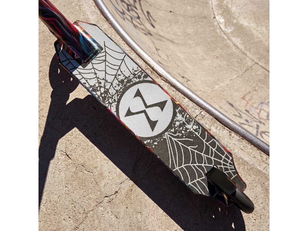 Vidlice a hrany desky zdobí dynamická vícebarevná grafika ve formě barevných „šmouh“ v odstínech modré, růžové, červené a fialové. Horní část desky doplňuje grafitový motiv pavoučí sítě s centrálním symbolem, zatímco spodní strana desky zdůrazňuje výrazný kontrastní motiv pavouka. Celek vytváří moderní vizuální styl inspirovaný street artem a komiksovou estetikou.