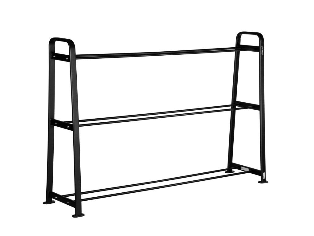 Stojan STR43 se třemi úrovněmi uložení umožňuje přehledné rozdělení míčů podle velikosti a barvy. Na spodní polici jsou uloženy černé míče, uprostřed fialové a na horní polici grafitové, což nejen usnadňuje přístup k vybavení, ale také dodává tréninkovému prostoru moderní a profesionální vzhled.