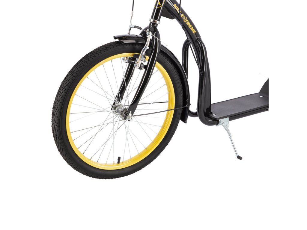 Koloběžka NILS EXTREME WH-200 je ideálním prostředkem pro zdolávání městských uliček. Model WH-200 je koloběžka se sportovním charakterem. Díky nosnosti 100 kg si ji může užívat celá rodina. Rám je vyroben z kvalitní oceli, na ráfky jsou obuty pneumatiky s duší a pro maximální bezpečnost je koloběžka vybavena ocelovými brzdami typu "V-brake". Tyto vlastnosti koloběžku přímo předurčují k použití na asfaltu, dlažbě, ale i na štěrku a nezpevněných stezkách. Integrovaný stojánek pak usnadňuje parkování koloběžky a velké přední kolo zlepšuje ovladatelnost a prostupnost terénem. WH-200 je navíc vybavena blatníky, které využijete zejména na polních cestách a nebo když Vás zastihne dešťová přeháňka.