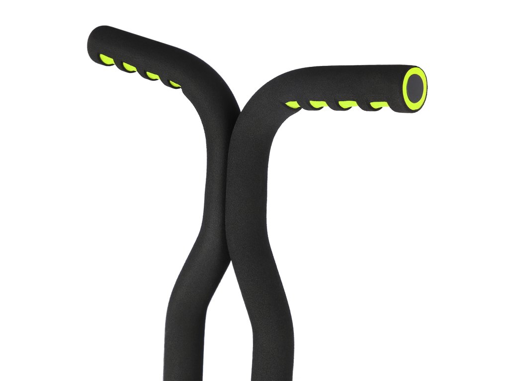 Ocelový rám garantuje nosnost 70 kilogramů. Rukojeti jsou potaženy PU pěnou, která se přizpůsobí stisku dlaně, zajistí komfortní úchop a zamezí zklouznutí dlaně z madla. Na stupačky byl použit tvrzený plast a jejich povrch je opatřen drážkamy proti sklouznutí boty. Kruhová koncovka skákací tyče je osazena gumou, její tvar umožňuje provádění skoků do všech směrů.