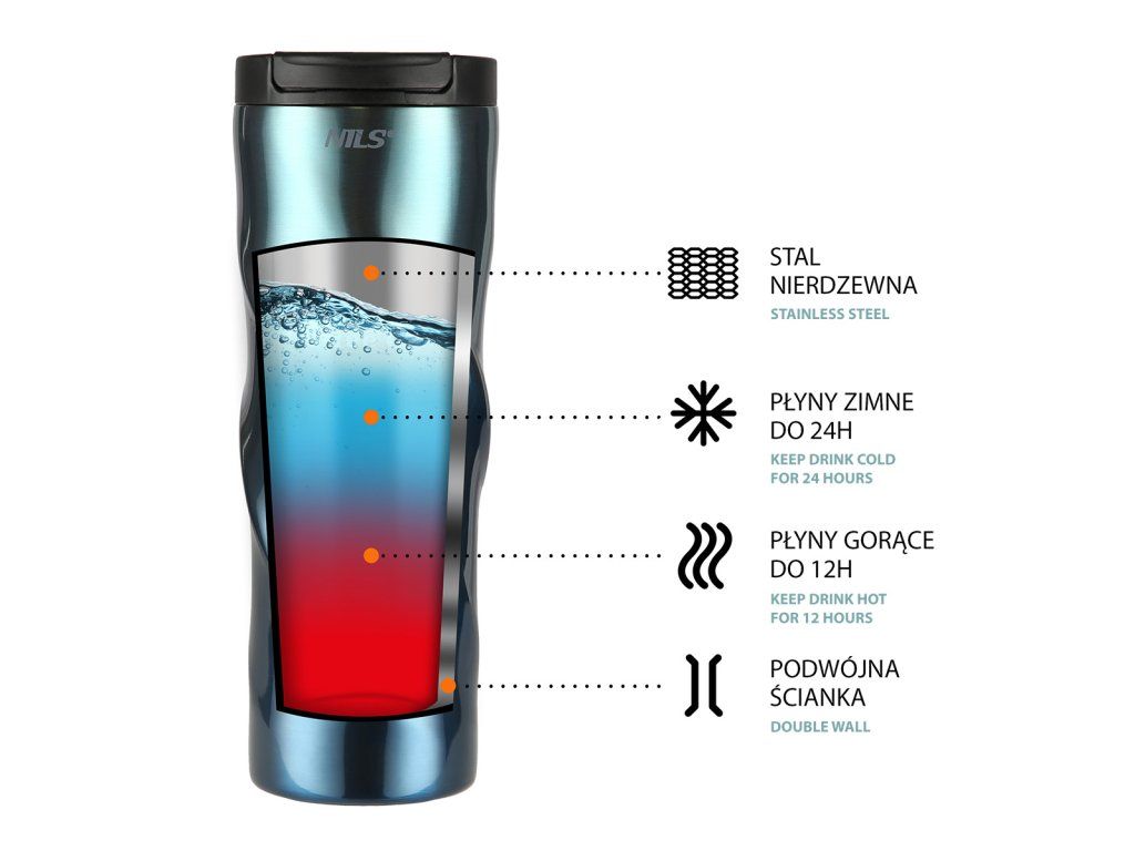 Termohrnek je vyroben z nerezové oceli s dvojitou stěnou, která zaručuje uchování teplých nápojů po dobu 12 hodin a studených po dobu 24 hodin, nezáleží tedy, zda si do hrnku připravíte ranní kávu, kterou vypijete cestou do práce a nebo zda si do něj přelijete oblíbenou limonádu a vezmete si jej s sebou na několikahodinovou procházku do přírody, termohrnek udrží Váš nápoj ve správné teplotě.