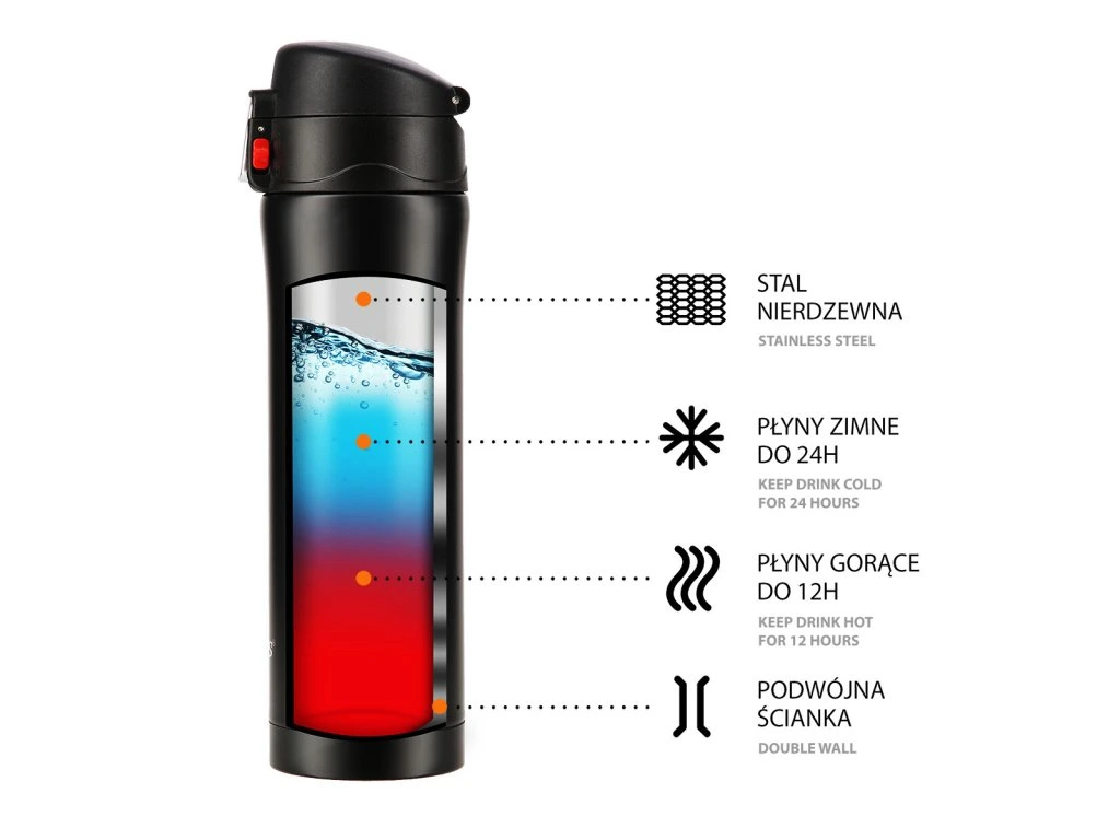 Termoska je vyrobena z nerezové oceli s dvojitou stěnou, která zaručuje uchování teplých nápojů po dobu 12 hodin a studených po dobu 24 hodin, nezáleží tedy, zda si do termosky připravíte ranní kávu, kterou vypijete v kanceláři a nebo zda si do ní přelijete oblíbenou limonádu a vezmete si ji s sebou na několikahodinovou procházku do přírody, termoska udrží Váš nápoj ve správné teplotě.