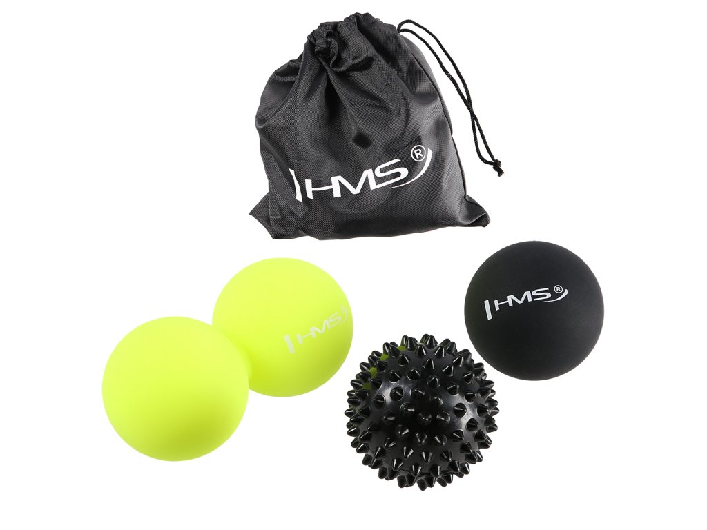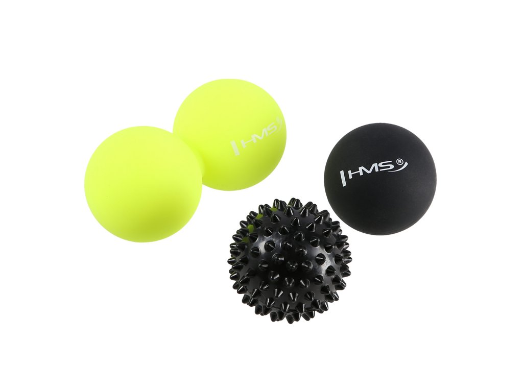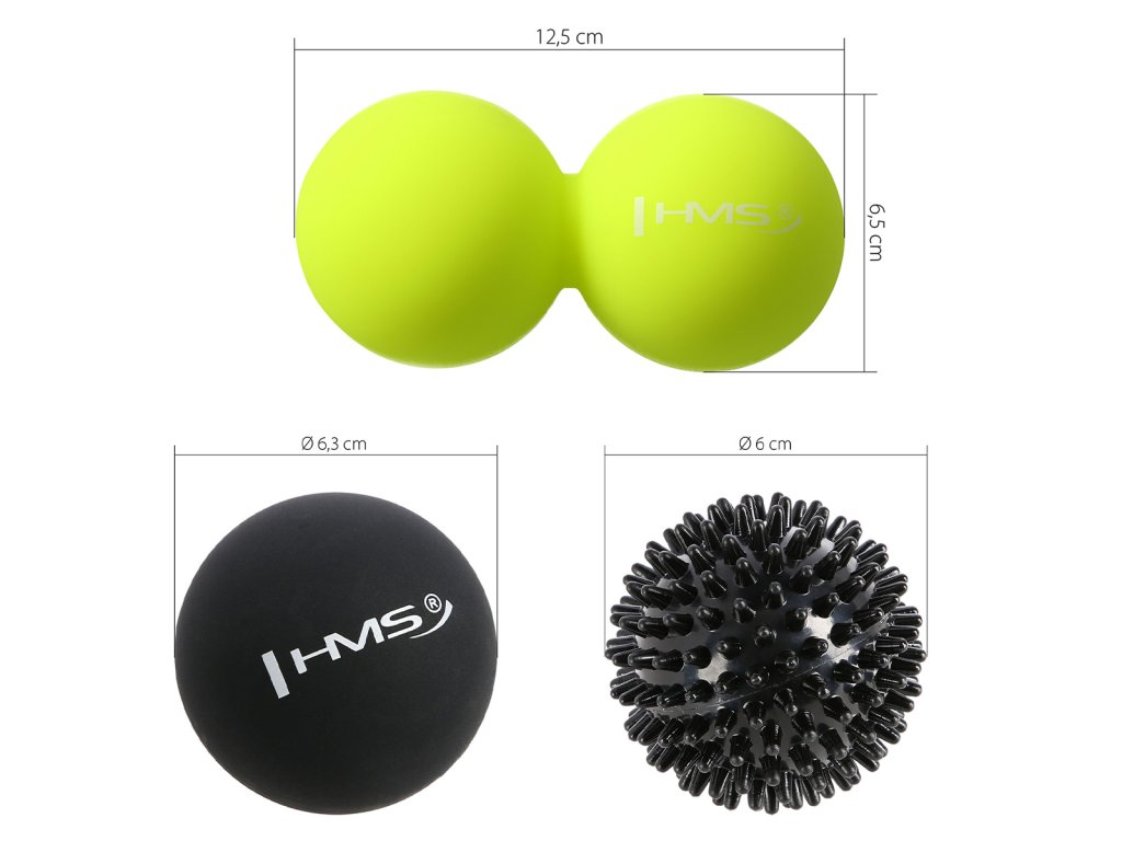 Sada masážních míčků HMS BLS01 je dokonalým doplňkem k větším, masážním přístrojům. Míček HMS BLC01 o průměru 6 cm je ideální k masáži spoušťových bodů a míst s napjatými fasciemi. Dvojitý míček HMS BLC02 je ideální pro ošetření hlubokých svalových skupin nebo těžko přístupných oblastí těla, jako je krk, hýždě, ramena a hrudník. Pomocí míčku HMS BLP01 s hroty lze bodově ošetřit potenciální zdroje bolesti.