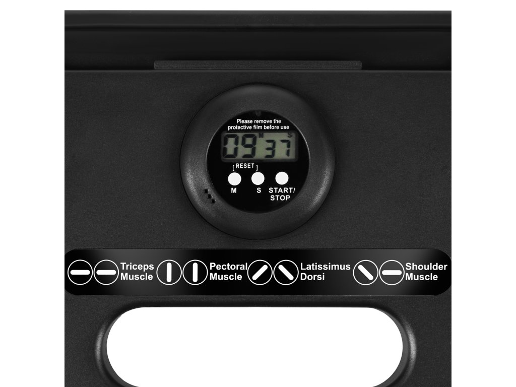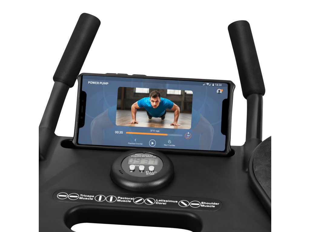 Vestavěný časovač (min/sek) usnadňuje intervaly a držák na telefon umožňuje sledovat tréninkové aplikace nebo instruktážní videa — bez nutnosti držet zařízení v ruce.