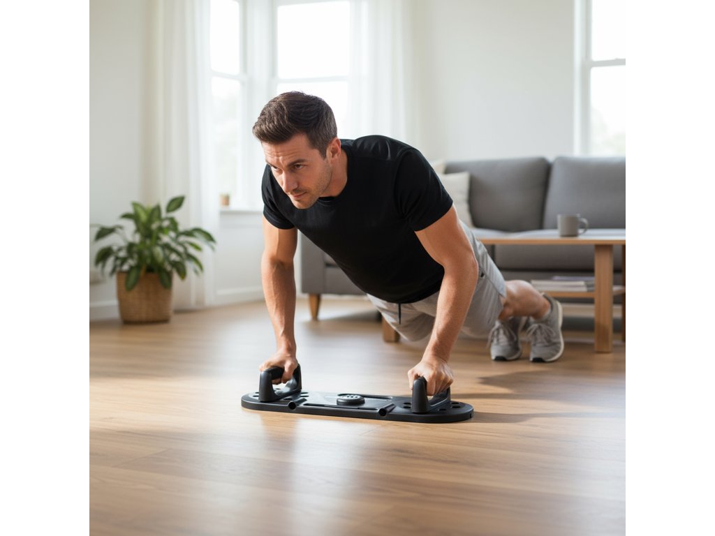 - Kliky a plank: dvě rukojeti „push-up“ lze zacvaknout do různých otvorů desky, čímž měníš úhel a šířku úchopu (prsa, ramena, tricepsy, core).