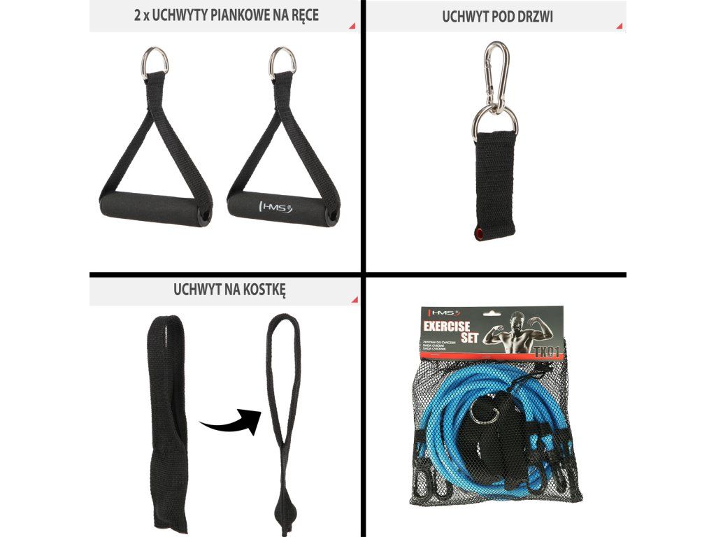TX01 Sada se skládá ze 3 - odporové gumy, 2 - rukojeti 1 - Upevnění ke kotníku, 1 - upevnění na dveře.