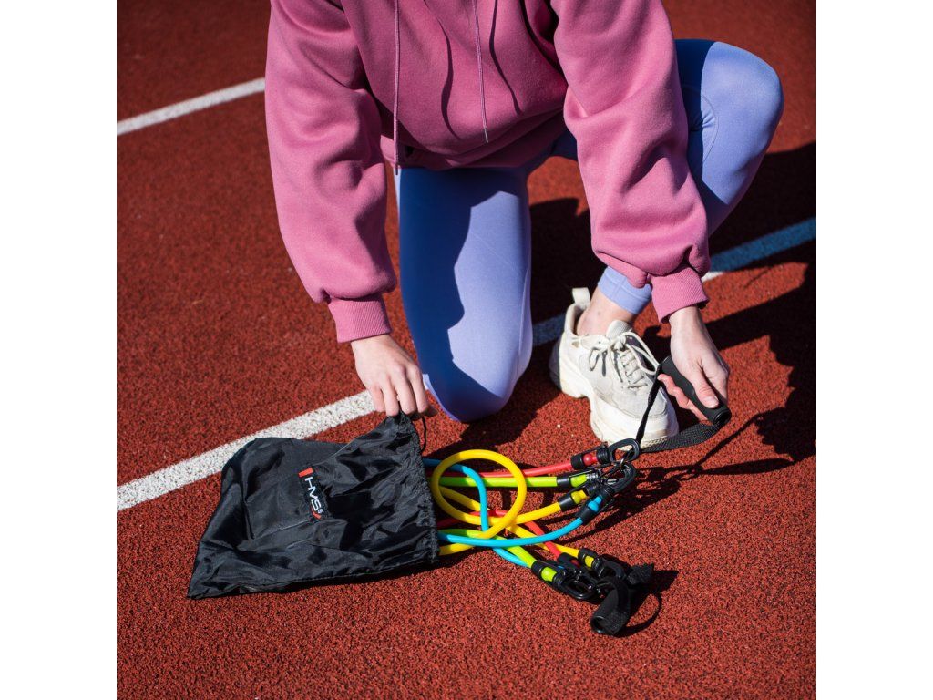 TX30 sestava cvičebních gum a příslušenství k nim. Sada obsahuje 5x odporová guma, 2 - úchyty na ruce, 2 - úchyty kotníku, 1 - upevnění na dveře.