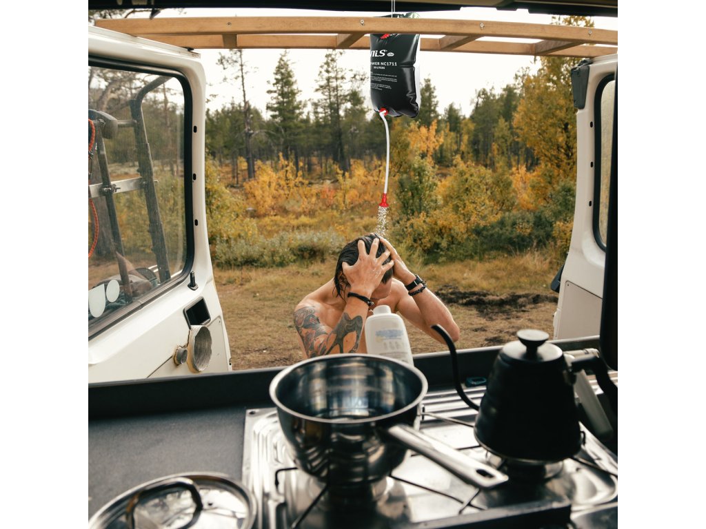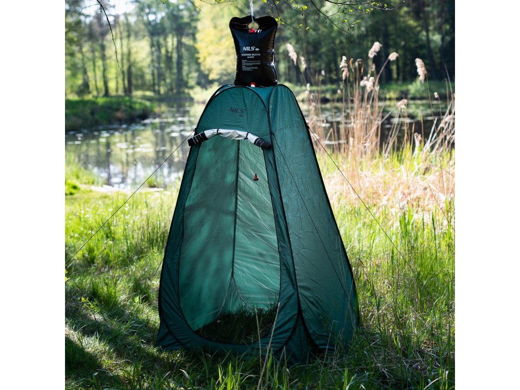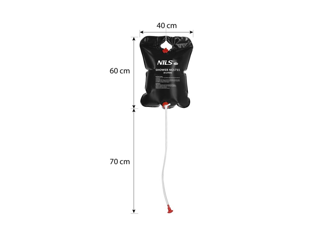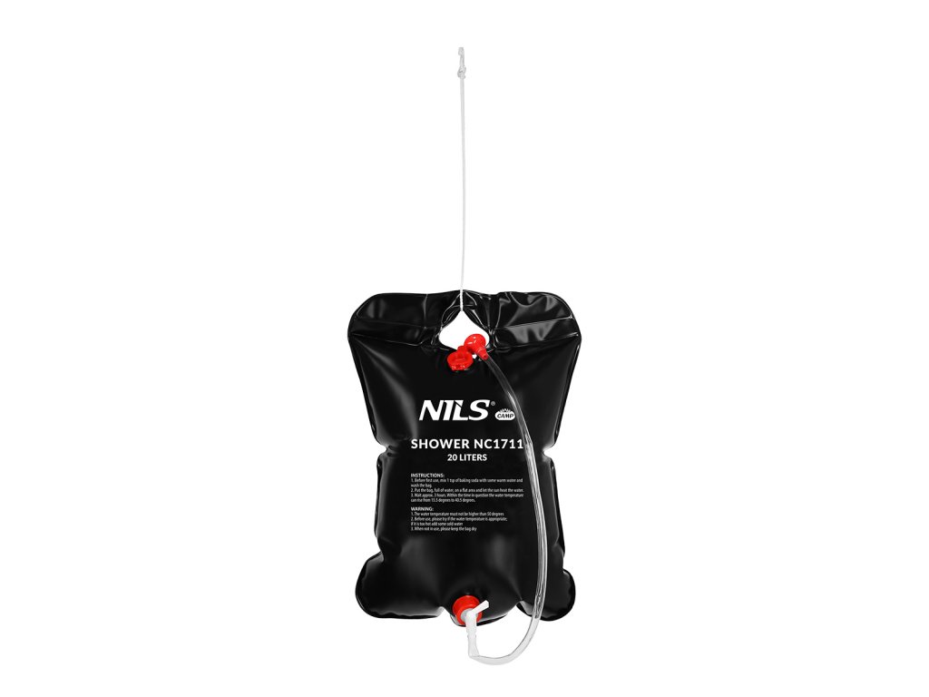 Přenosná turistická sprcha NC1711 od NILS Camp o objemu 20 litrů, která je skvělým řešením pro každého, kdo tráví čas kempováním, cestováním nebo kdekoli, kde není přístup do koupelny s teplou vodou.