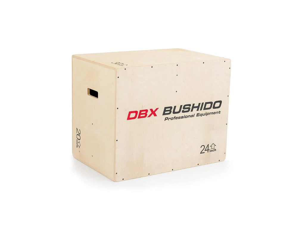 Plyometrický box DBX BUSHIDO Premium je bedna určena pro kondiční trénink. Box je nedílnou součástí každého crossfitového centra, pomůckou profesionálních sportovců nebo i atletů. Vyroben je z 15 mm překližky a má klasické rozměry 76,2 x 60,96 x 50,8 cm (30 x 24 x 20 palců). Varianta "Premium" má jednotlivé desky opatřené zámky, které do sebe během montáže přesně zapadnou a zvyšuje se tak celková stabilita a odolnost bedny.