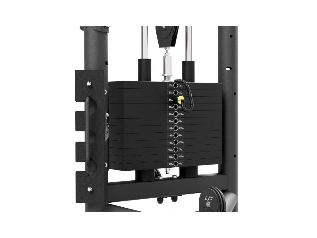 Vrchní a spodní kladka UpForm UF-002 je vybavena sadou závaží čítající 12 cihel o celkové hmotnosti 90 kilogramů odstupňovaných po 7,5 kg a jednou doplňkovou cihlou o hmotnosti 3,75 kilogramů, ta se umisťuje nad první pevnou cihlu a používá se k volení hmotnosti od 3,75 kilogramů. Volič váhy je opatřen nálepkami pro rychlou volbu požadované zátěže a jistící čep je připevněn na lanku, takže nehrozí jeho ztráta. Horní rameno se nachází ve výšce 220 centimetrů, na stroji tak může pohodlně trénovat kdokoliv do výšky 200 cm. Veškeré kladky jsou schovány pod kovovými kryty s logem UpForm. Ocelové lanko je pokryto černým PVC, je zakončeno masivním okem a je odpruženo gumovým tlumičem.