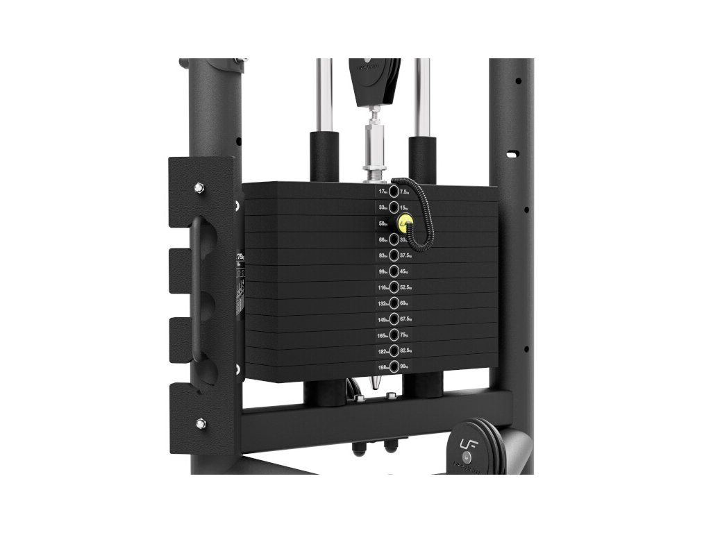 Posuvná kladka UpForm UF-001 je vybavena sadou závaží čítající 12 cihel o celkové hmotnosti 90 kilogramů odstupňovaných po 7,5 kg a jednou doplňkovou cihlou o hmotnosti 3,75 kilogramů, ta se umisťuje nad první pevnou cihlu a používá se k volení hmotnosti od 3,75 kilogramů. Volič váhy je opatřen nálepkami pro rychlou volbu požadované zátěže a jistící čep je připevněn na lanku, takže nehrozí jeho ztráta. Horní rameno se nachází ve výšce 220 centimetrů, na stroji tak může pohodlně trénovat kdokoliv do výšky 200 cm. Veškeré kladky jsou schovány pod kovovými kryty s logem UpForm. Ocelové lanko je pokryto černým PVC, je zakončeno masivním okem a je odpruženo gumovým tlumičem. Posuvný mechanizmus je opatřen madlem pro snadný přesun a pružinovým, jistícím kolíkem. Pojezd lze nastavit do 18-ti poloh, které jsou číslovány.