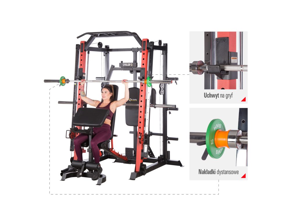 CYKLOP 3 je kombinací multipressu, hrazdy, motýlka, stojanu na osu a dvou posuvných kladek. Spojením všech prvků do jednoho celku získáme univerzální zařízení, které umožňuje trénovat všechny svalové skupiny. Efektivitu tréninku a jeho možnosti zvýší přiložené příslušenství v podobě adaptérů ke kladkám (dvojité tricepsové lano, úzký, lomený adaptér, popruh na kotník a nylonové popruhy s madlem), výškové nastavitelné DIP adpatéry, háky pro odložení osy a multiosý kloub (takzvaný landmine). Hlavní osa je opatřena pěnovým návlekem pro maximální pohodlí během tréninku dřepů. Dorazy pultipresu jsou tvořeny pružinami, které pohltí většinu energie při nouzovém upuštění osy.