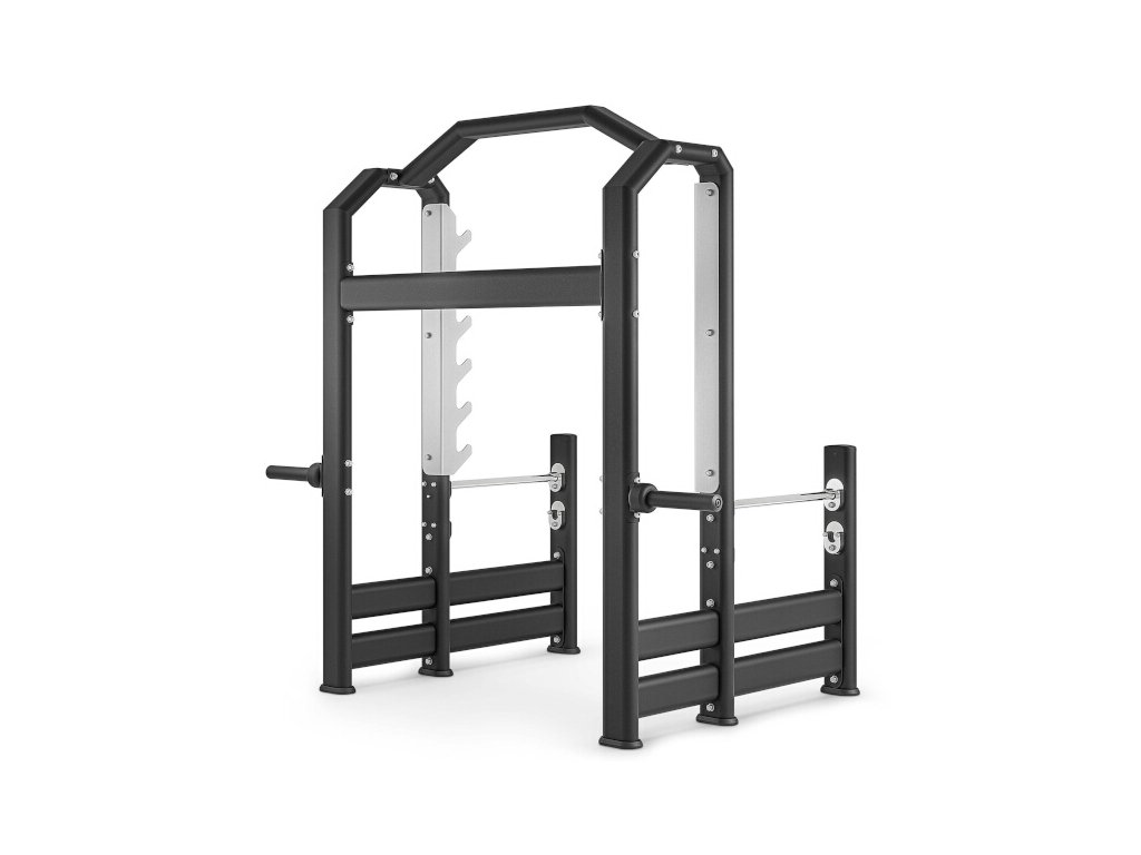 Tento model je vybaven šesti páry úchytů pro uložení činky. Díky tomu můžete provádět jak dřepy s činkou, tak i výstupy na špičky ve stoje a mrtvé tahy.