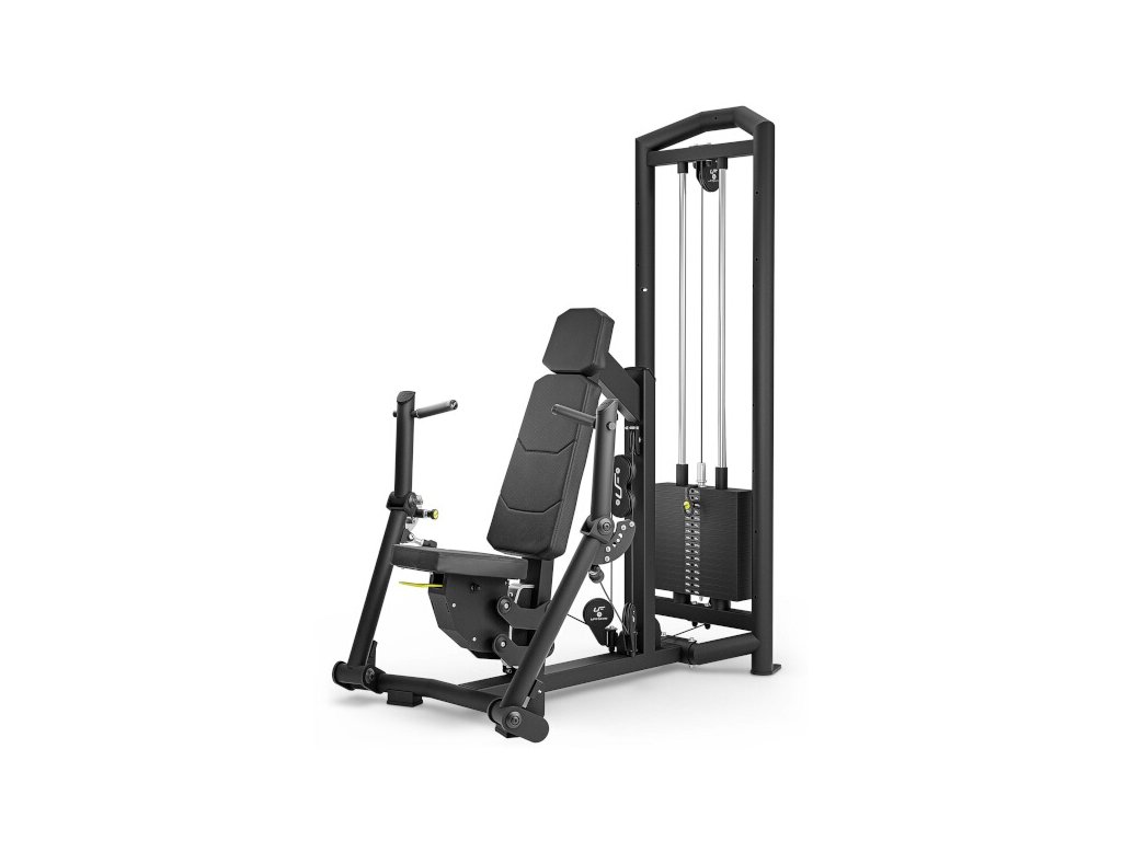 Seated Chest Press UpForm UF-021, neboli tlaky v sedě, je profesionální tréninková věž určená pro náročné uživatele. Díky chytrému designu, velikosti zásobníku a okamžité změně zátěže je věž ideální pro silový a sportovní trénink. Konstrukcí je stanice určena pro použití v komerčních posilovnách, fitnesscentrech nebo klubech. Rám je vyroben z ocelových profilů 100 x 60 x 3 milimetry a ocelových trubek s profilem 60,3 x 3,2 mm a 76,1 x 3,2 milimetrů, které zaručují vysokou stabilitu konstrukce a její dlouhou životnost i při náročném trénování s plně využívanou sadou závaží.