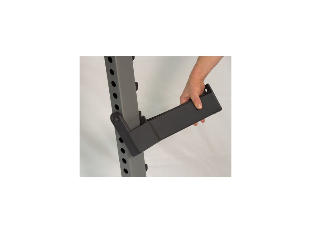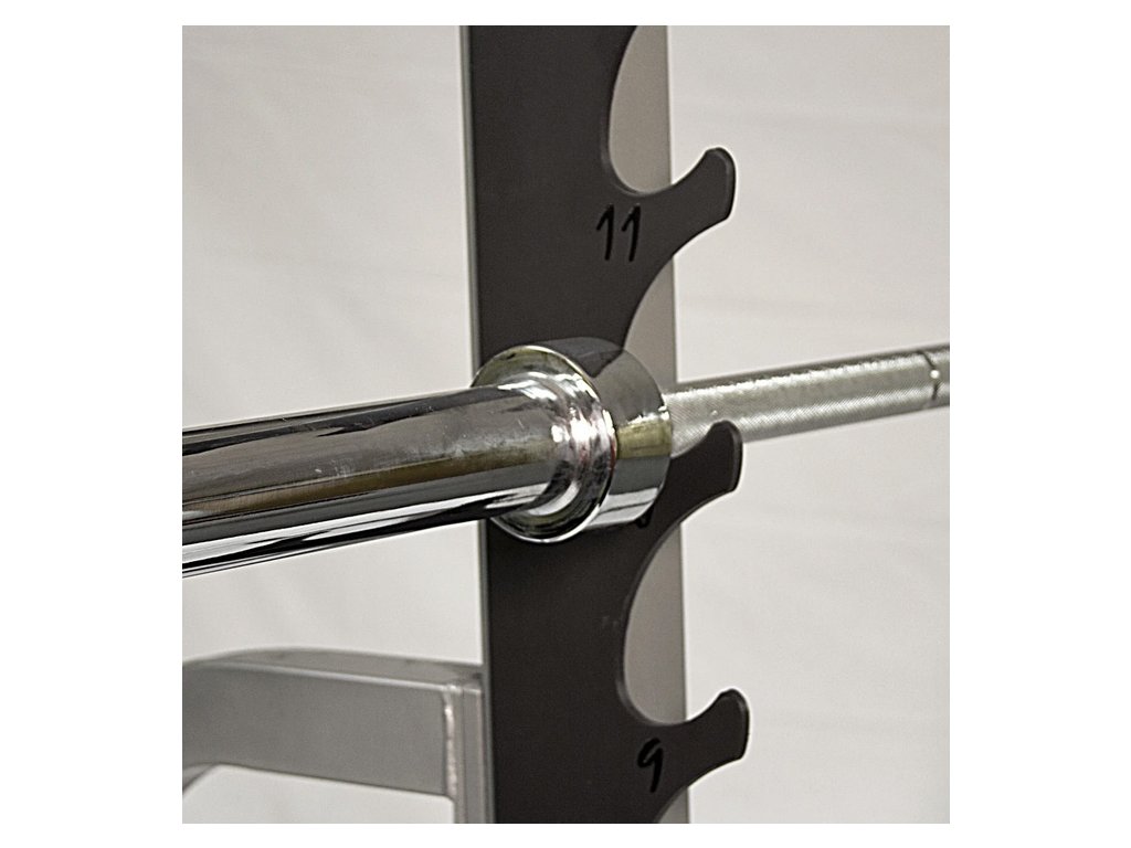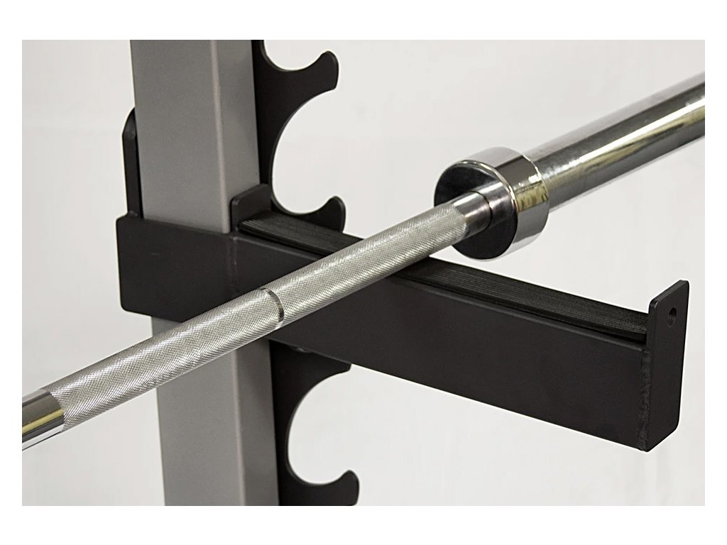 - 4 odkladací trny pro kotouče s olympijským rozměrem pro rychlý a snadný přístup a zároveň pro zachování organizovaného prostoru pro cvičení