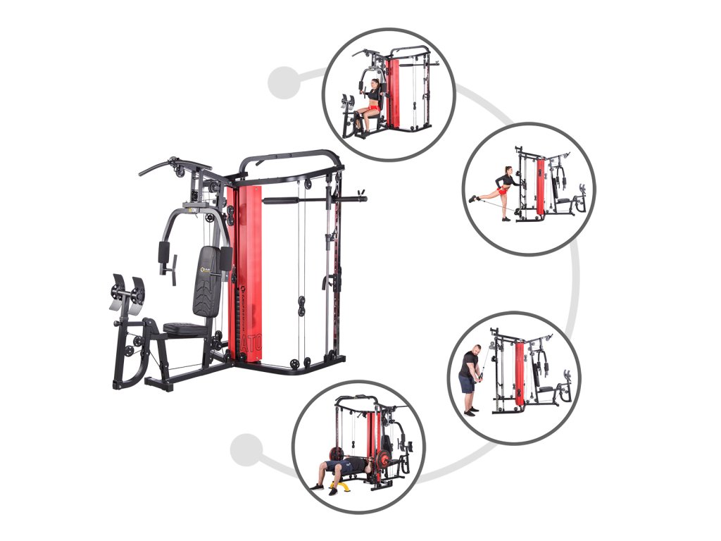 ATOM v sobě snoubí multipress, dvě posuvné kladky, rameno na tlaky / motýlka, leg press a hrazdu, takže jde o skutečně komplexní stroj. Součástí dodávky je také dvojité, tricepsové lano, tricepsový adaptér, popruhy ke kladkám a opasek na kotník.