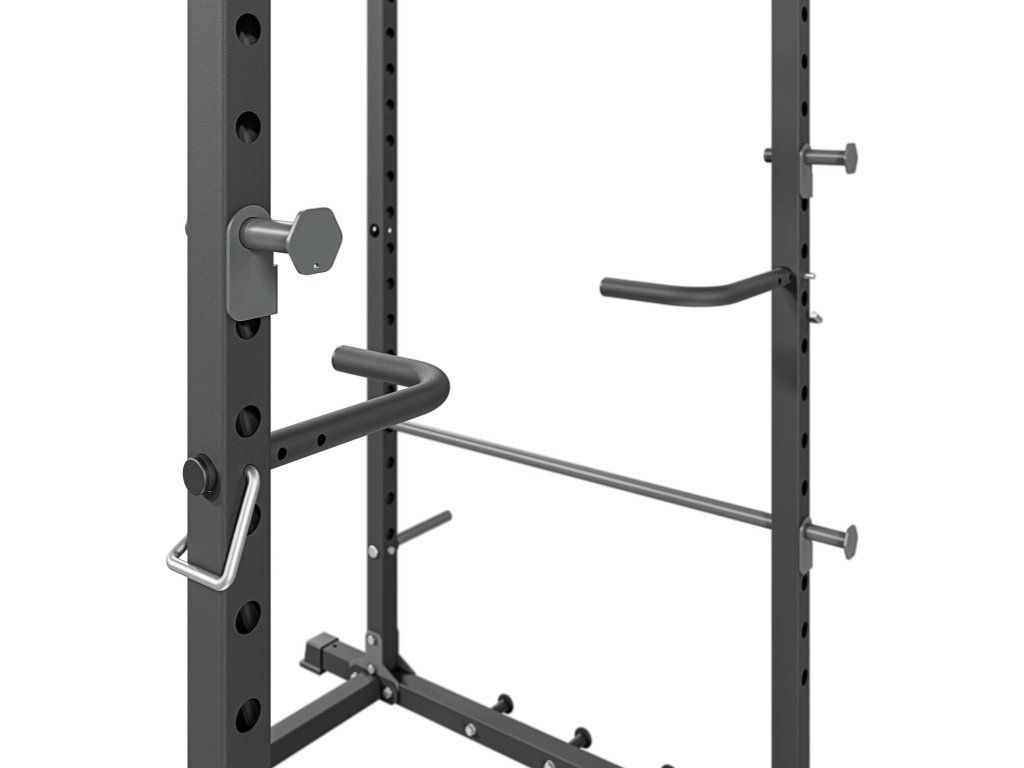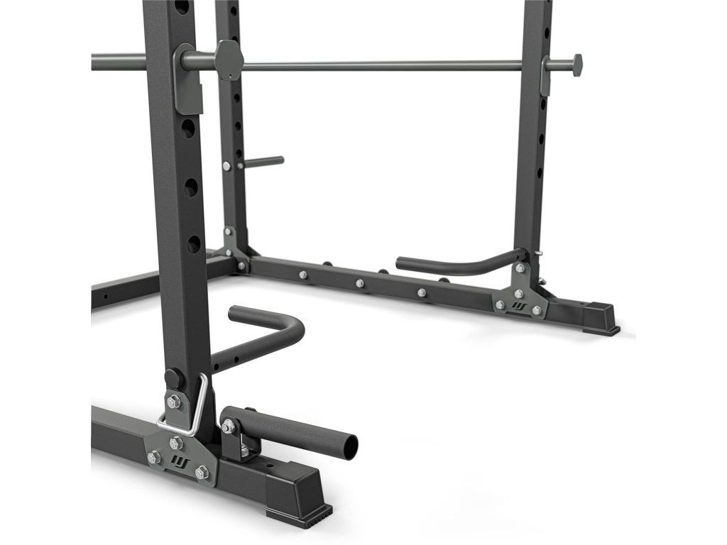 Součástí klece jsou boční bezpečnostní tyče, které slouží jako pojistka při dřepech nebo bench pressu. V případě selhání série lze činku bezpečně odložit bez rizika zranění.