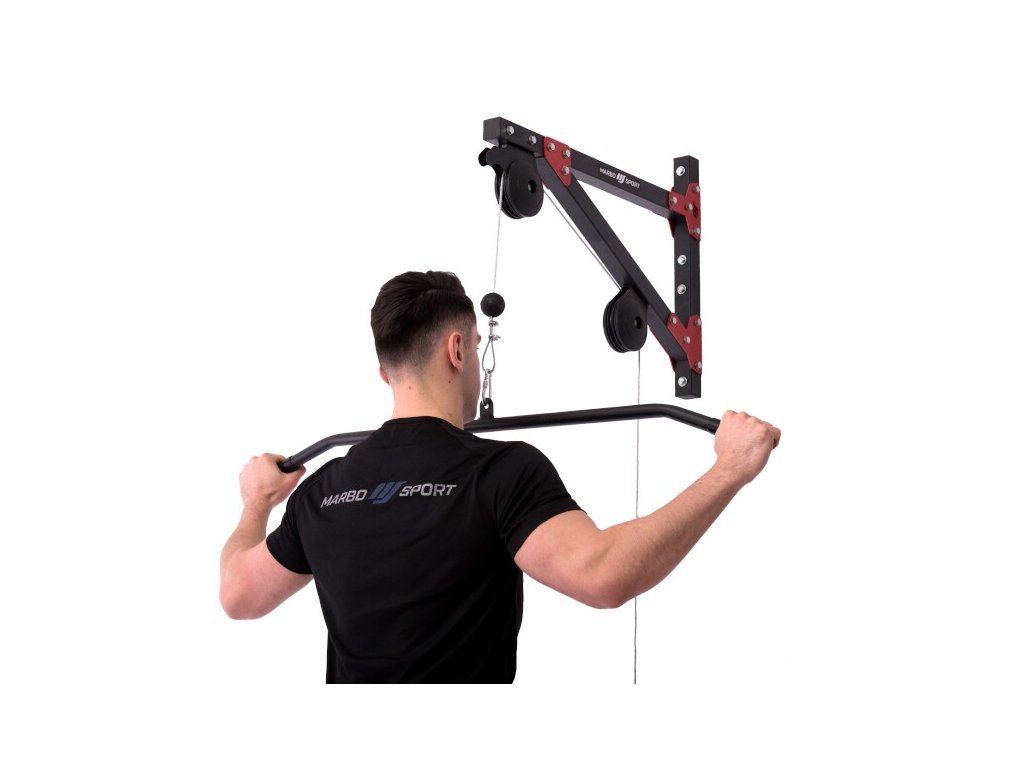 Horní kladka s montáží do zdi MARBO MH-W108 2.0 je inovovaným modelem kladky MH-W108. Ve srovnání se svým předchůdcem má MH-W108 2.0 moderní design, vylepšené kladky a nakládací trn má širší, trojúhelníkovou zarážku na kotouče a je také delší.