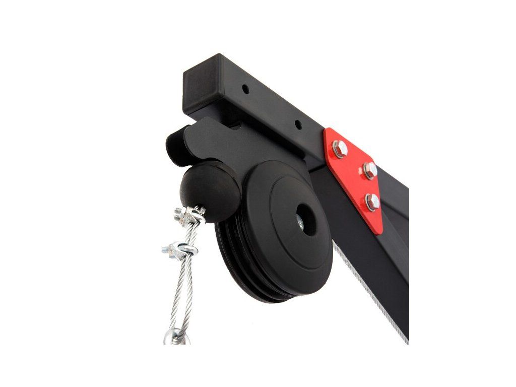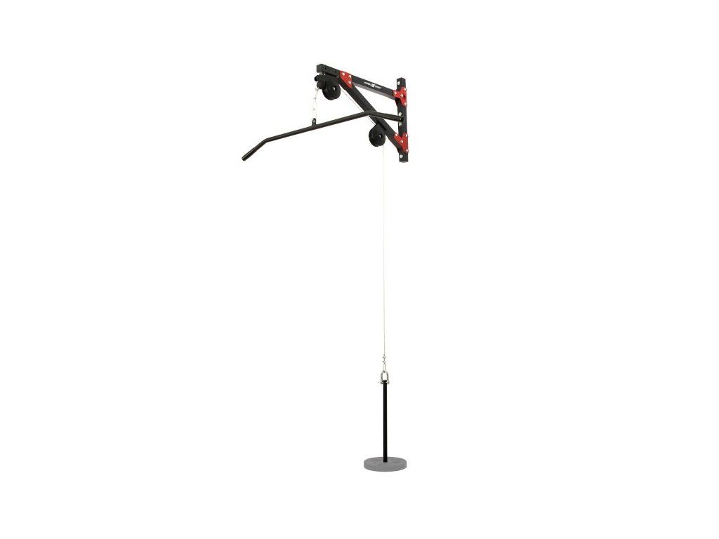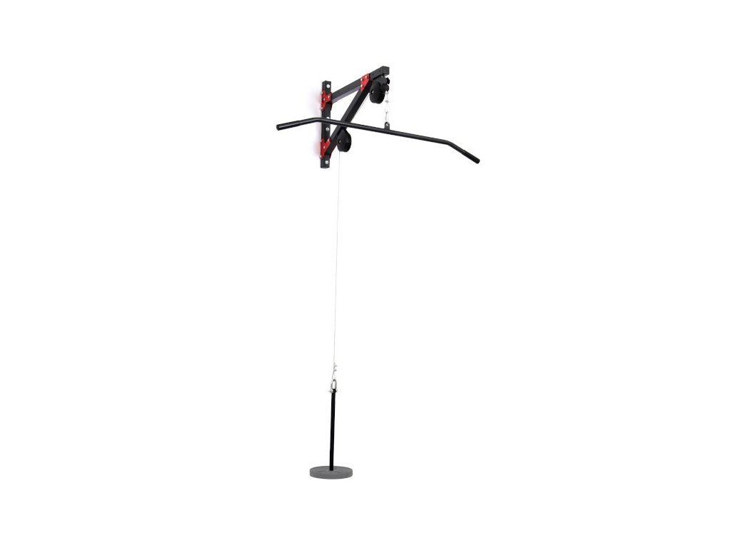V balení naleznete samotnou konstrukci kladky, která je vyrobena z ocelového profilu 40 x 40 milimetrů. Ocelové lanko, 2 karabiny, nakládací trn s délkou 46 centimetrů a široký adaptér MH-C001. Maximální nosnost je 120 kilogramů.