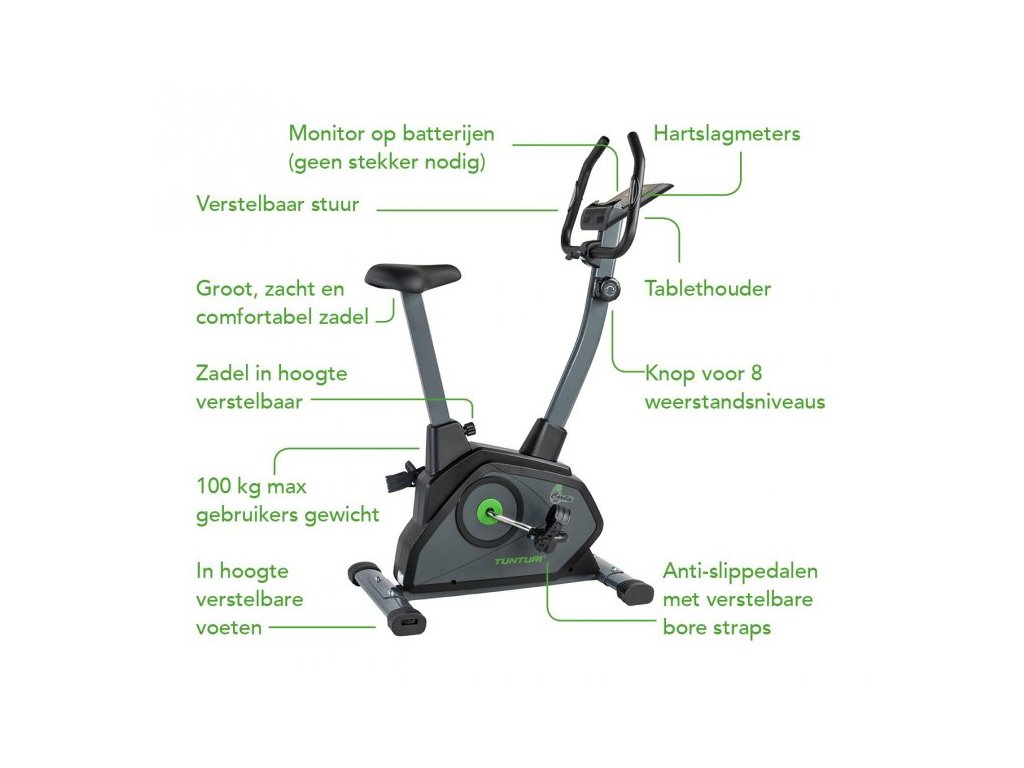 TUNTURI Cardio Fit B35 Heavy Bike patří k základním rotopedům s kvalitním provedením a určený do domácího prostředí. Nabízí magnetický odpor, který je manuálně nastavován v rozmězí 1-8. Šlapací miskový střed má plastové pedály s nastavitelnými řemínky. Výškově nastavitelné sedlo a sklon řídítek zajišťuje pohodlné trénování. Součástí výbavy je i držák na tablet pro sledování filmů atd. Setrvačník určující plynulost šlapání má hmotnost 4 kg. V neposlední řadě nabízí transportní kolečka pro snadnější manipulaci v prostoru a vyrovnávače nerovnosti podlahy.