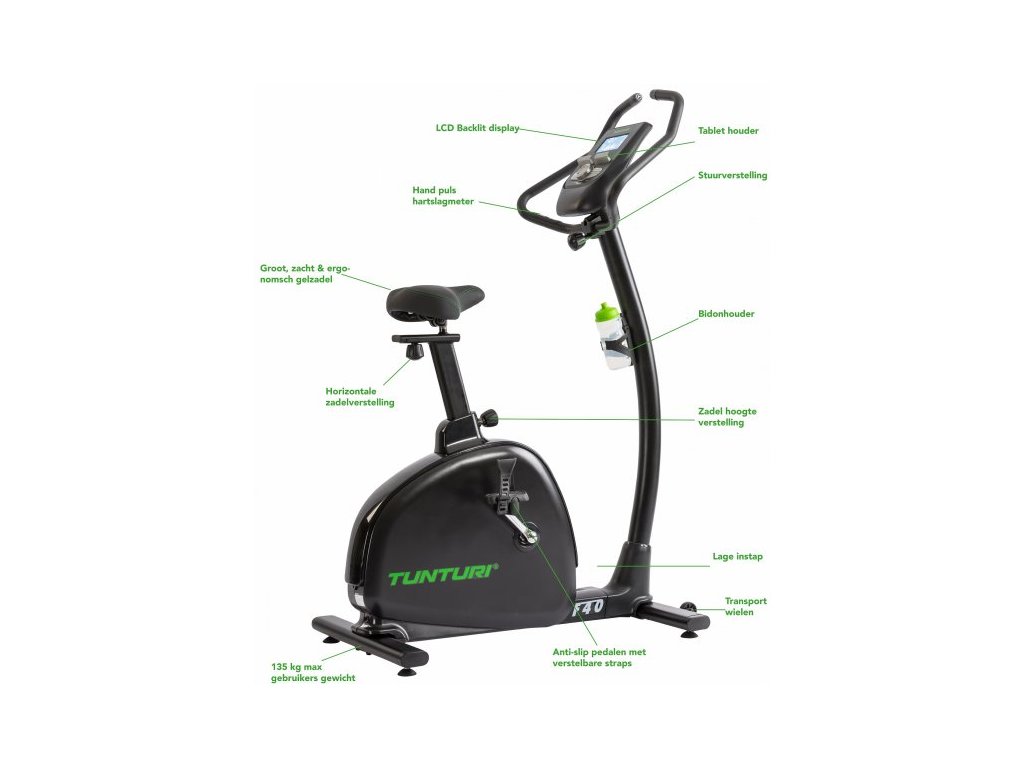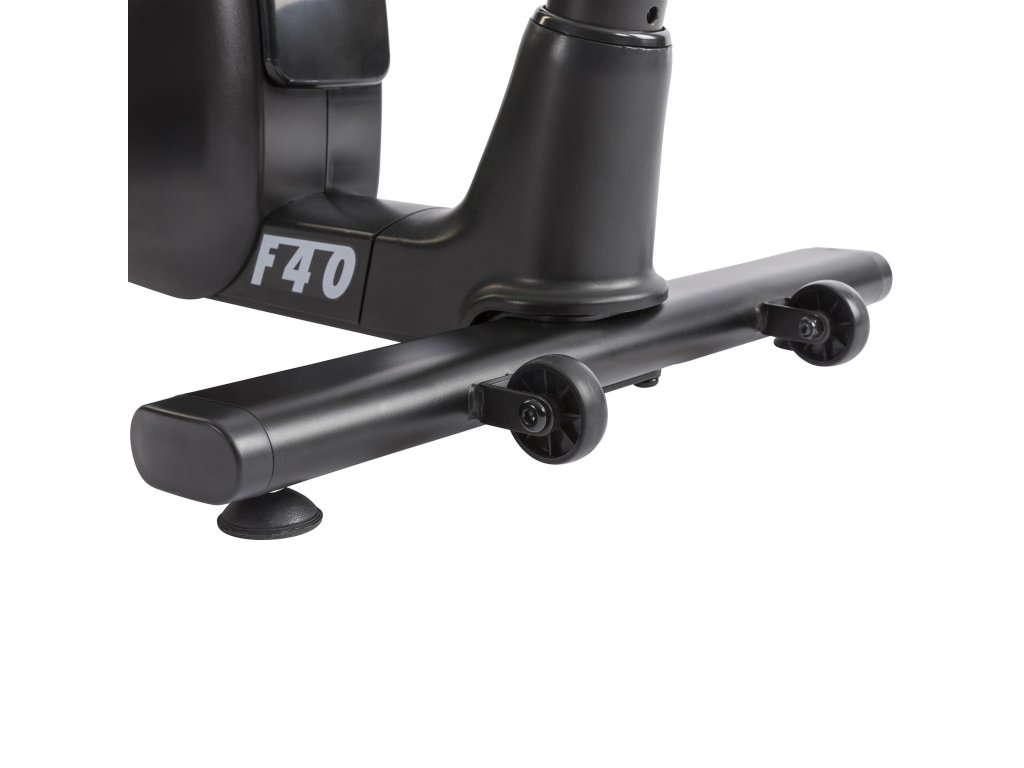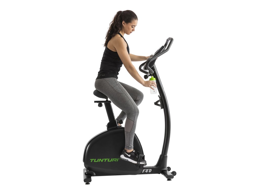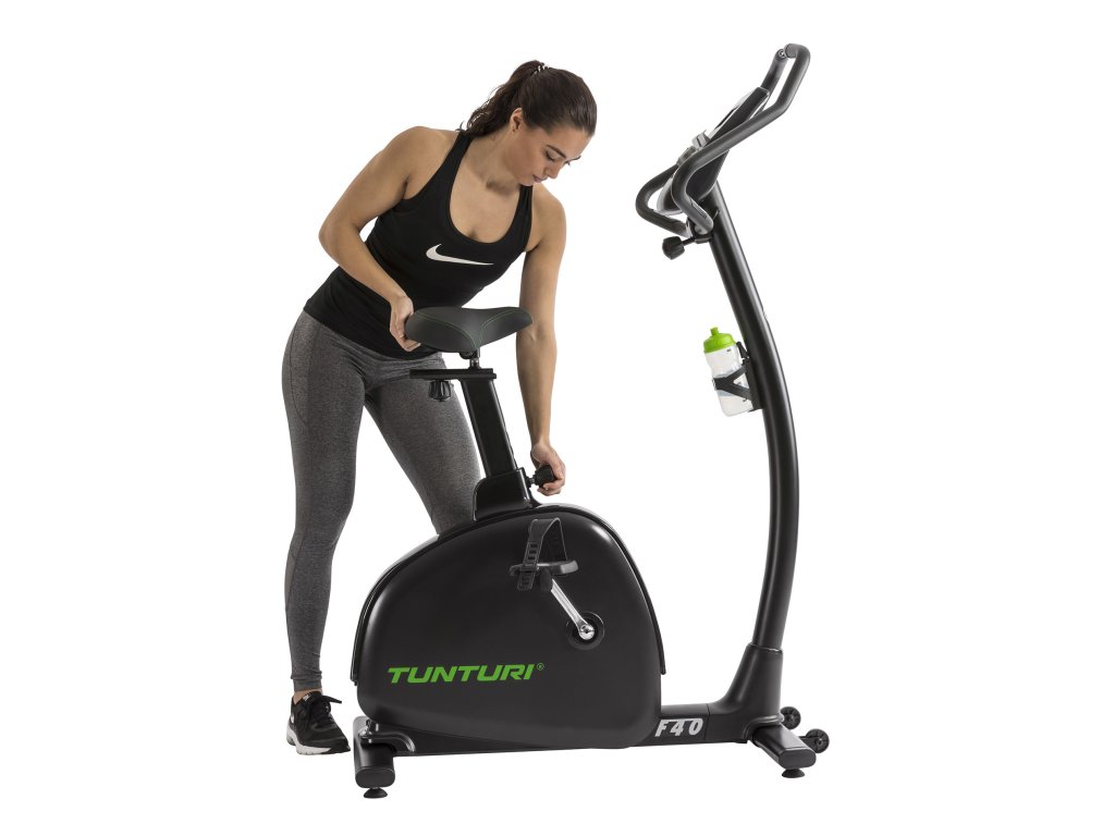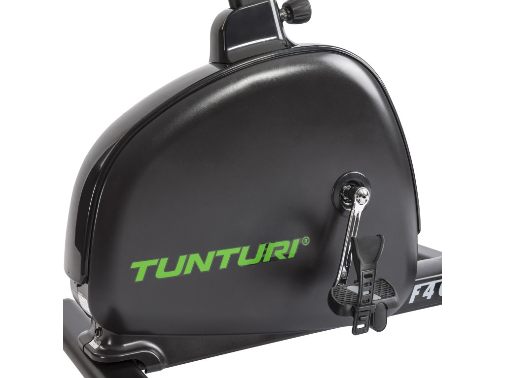 Rotoped je vybaven velice pohodlným sedlem, které je nastavitelné jak vertikálně, tak i horizontálně. Sedlo si tak lehce upravíte přímo na míru a navíc je možné přizpůsobit i sklon řídítek, což zajistí pohodlný trénink osobám různé výšky. Plastové pedály vybavené fixačními řemínky (klipsnami) drží bezpečně chodidlo na šlapačce. Předností modelu TUNTURI F40 Competence je nízký práh při nastupování a sestupování pro osoby se zdravotním hendikepem.