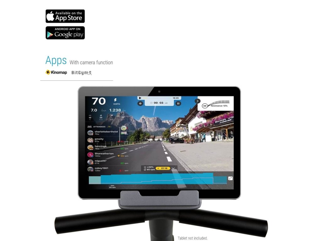 Kromě tradičního zobrazení na počítači máte také možnost zažít vzrušující živé trasy prostřednictvím aplikace. Tréninková aplikace BitGym přináší video záznam vaší preferované trasy do vašeho smartphonu nebo tabletu. Čím tvrději šlapete, tím rychleji projíždíte lesem nebo po nábřeží. Jednoduše položte svůj mobil na držák smartphonu/tabletu a užijte si tuto nejmodernější tréninkovou motivaci.