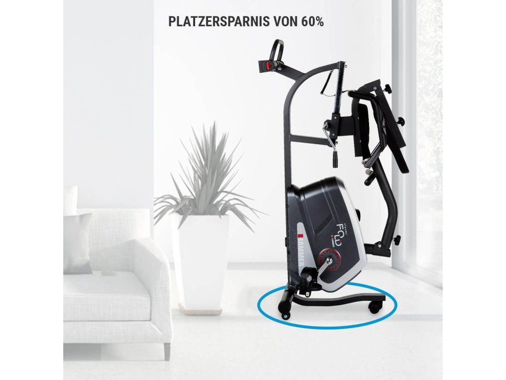 Doma je často málo místa. Horizontální rotoped HAMMER Clever Fold RC5 je dokonalým trenažérem především pro malé prostory. Pomocí tří jednoduchých kroků stroj složíte, zvednete (rozměry po složení: 61 x 62 x 95 cm) a díky transportním kolečkům pohodlně přesunete do rohu místnosti nebo postavíte vedle šatníku. Integrovaný přepravní kolečkový systém zajistí otočení na místě o 360 stupňů, což znamená, že HAMMER RC5 lze snadno přesunout do rohu, za dveře nebo vedle skříně stejně jako kufr, aniž by se zachytil v jakýchkoliv rozích. Maximální stabilitu vám zajistí vyrovnávače nerovnosti podlahy.