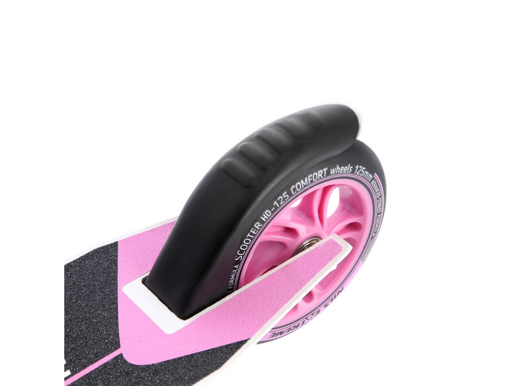 Řídítka mají šířku 46 centimetrů a rukojeti jsou opatřeny gumovými gripy, tato kombinace zaručuje pohodlný úchyt a jistotu v řízení i při vysokých rychlostech, kterých HD125 dosahuje díky polyuretanovým kolečkům o průměru 125 mm a ložiskům ABEC 5. Kolečka jsou opatřeny blatníky, které Vás udrží v čistotě i v případě, že potřebujete projet louží, nebo Vás zastihne například dešťová přeháňka. Zadní blatník zároveň slouží jako nožní brzda, ta umožňuje rychlé zastavení a tím zvyšuje bezpečnost koloběžky.