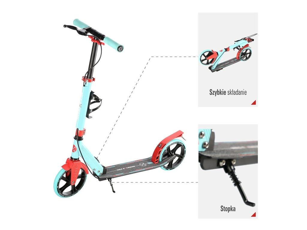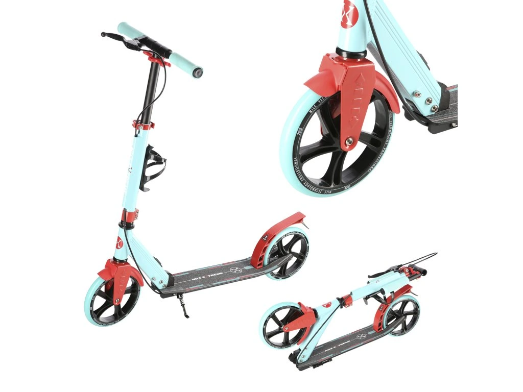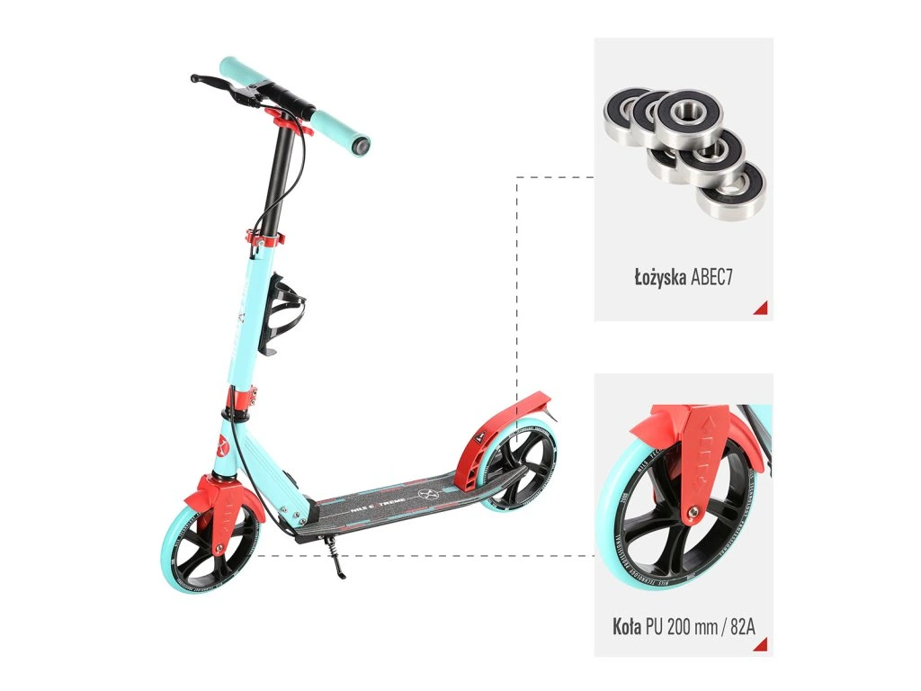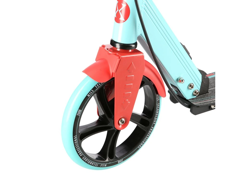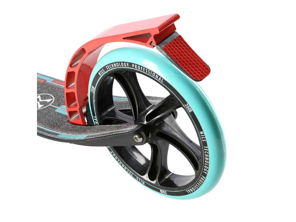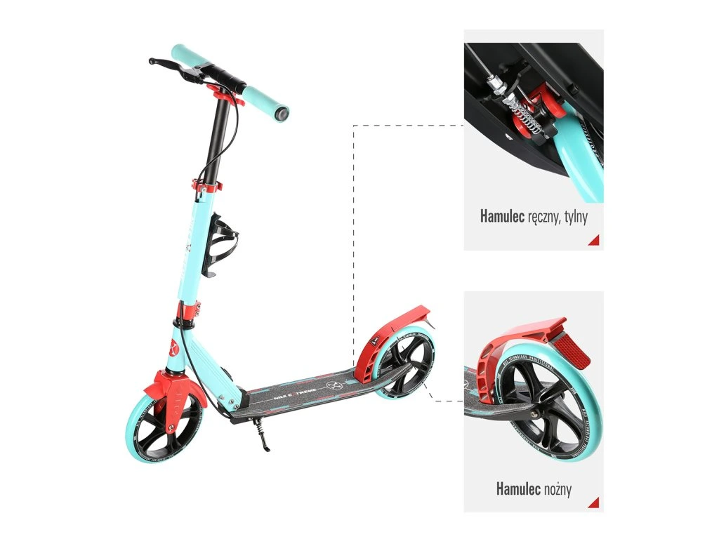 Zadní blatník slouží jako přítlačná brzda, která ještě podtrhuje brzdný účinek mechanické brzdy ovládané lankem z páčky na řídítkách, ty jsou opatřeny gumovými rukojeťmi, které zajišťují pevný a pohodlný úchop. Velká kola jsou osazena ložisky ABEC 7 a polyuretanovou pneumatikou o průměru 200 milimetrů. Tato kombinace zajišťuje rychlou, plynulou a bezpečnou jízdu. Na sloupku řídítek má své místo držák pro odložení láhve s nápojem, který najde své využití při delších vyjížďkách. Blatník na předním kole využijete, pokud Vás zastihne dešťová přeháňka.