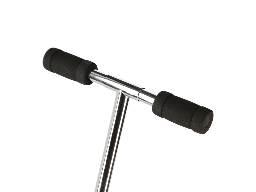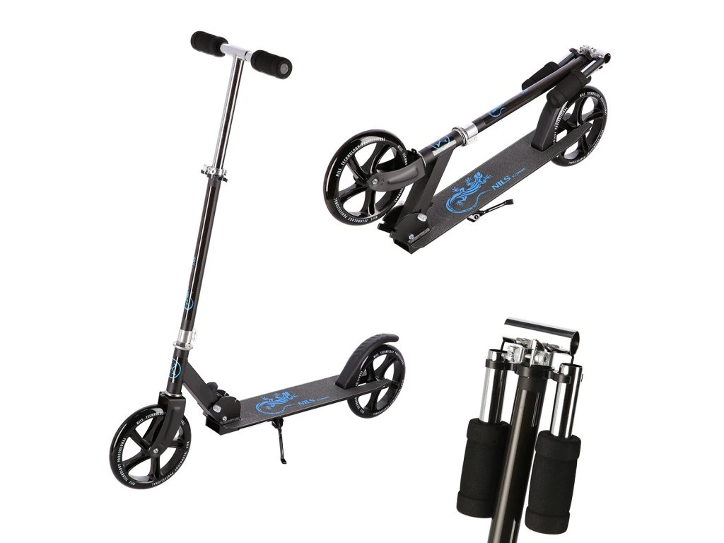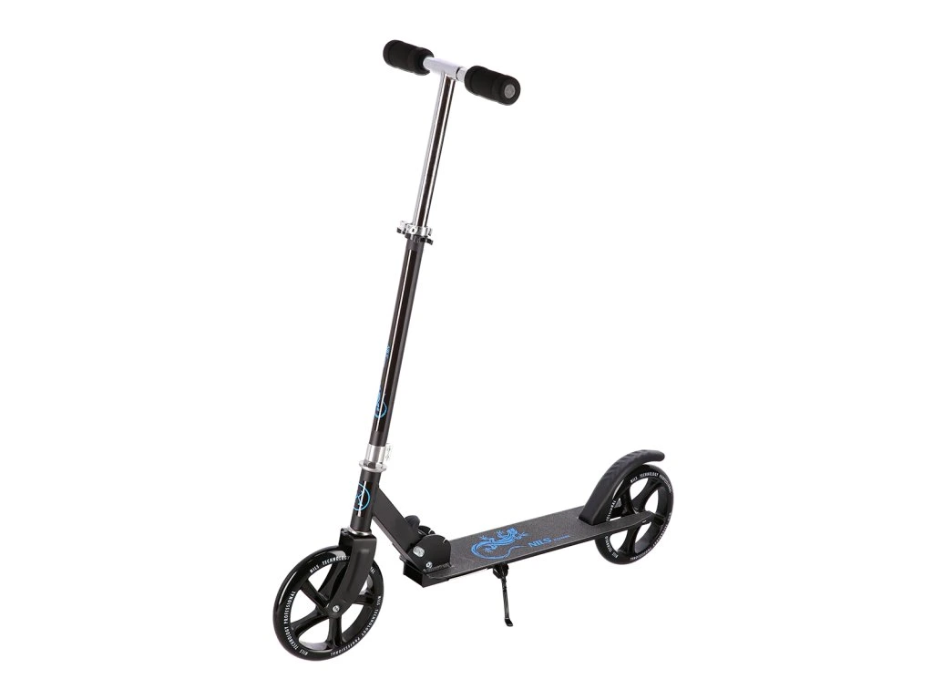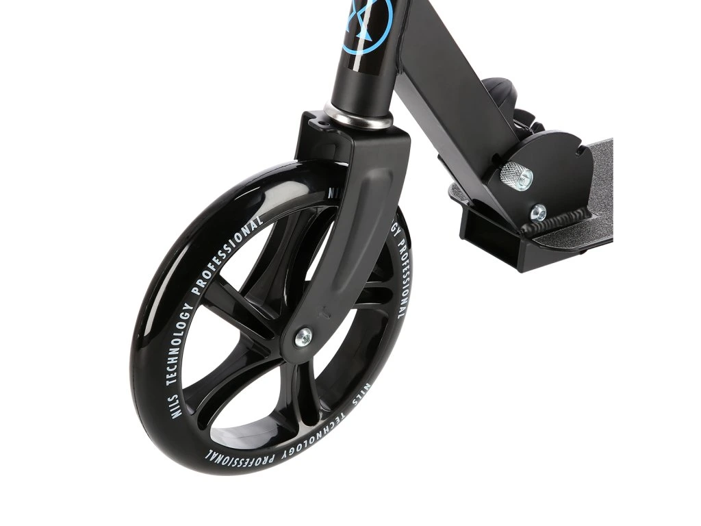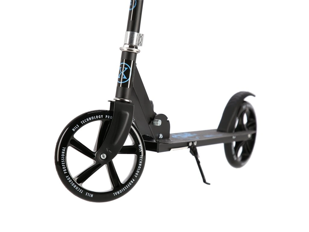 Zadní blatník slouží jako nášlapná brzda. Sklopná řídítka jsou opatřeny pěnovými rukojeťmi, které zajišťují pevný a pohodlný úchop. Řídítka jsou výškově nastavitelná do 3 úrovní. Velká kola jsou osazena ložisky ABEC 7 a polyuretanovou pneumatikou o průměru 200 milimetrů. Tato kombinace zajišťuje rychlou, plynulou a bezpečnou jízdu. Sklopný stojánek umožňuje postavení koloběžky, tekže ji není potřeba pokládat.