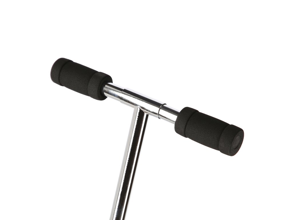 Zadní blatník slouží jako nášlapná brzda. Sklopná řídítka jsou opatřeny pěnovými rukojeťmi, které zajišťují pevný a pohodlný úchop. Řídítka jsou výškově nastavitelná do 3 úrovní. Velká kola jsou osazena ložisky ABEC 7 a polyuretanovou pneumatikou o průměru 200 milimetrů. Tato kombinace zajišťuje rychlou, plynulou a bezpečnou jízdu. Sklopný stojánek umožňuje postavení koloběžky, tekže ji není potřeba pokládat.