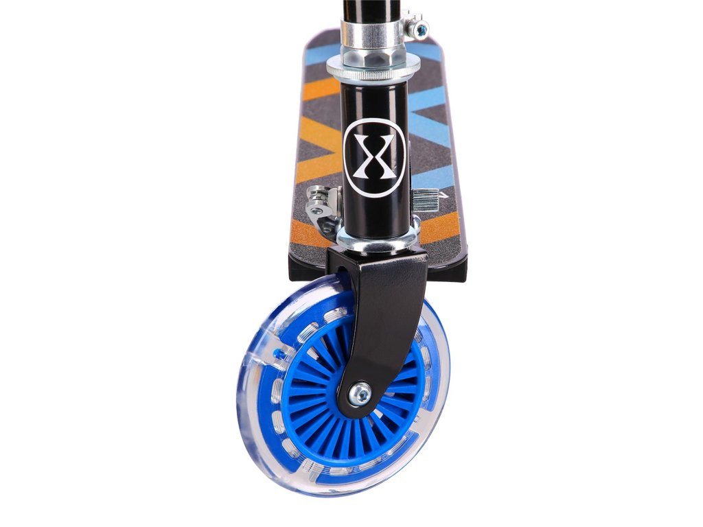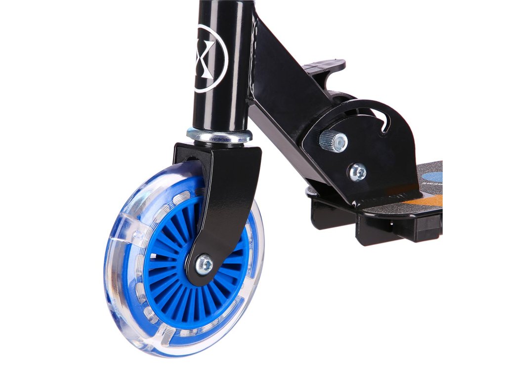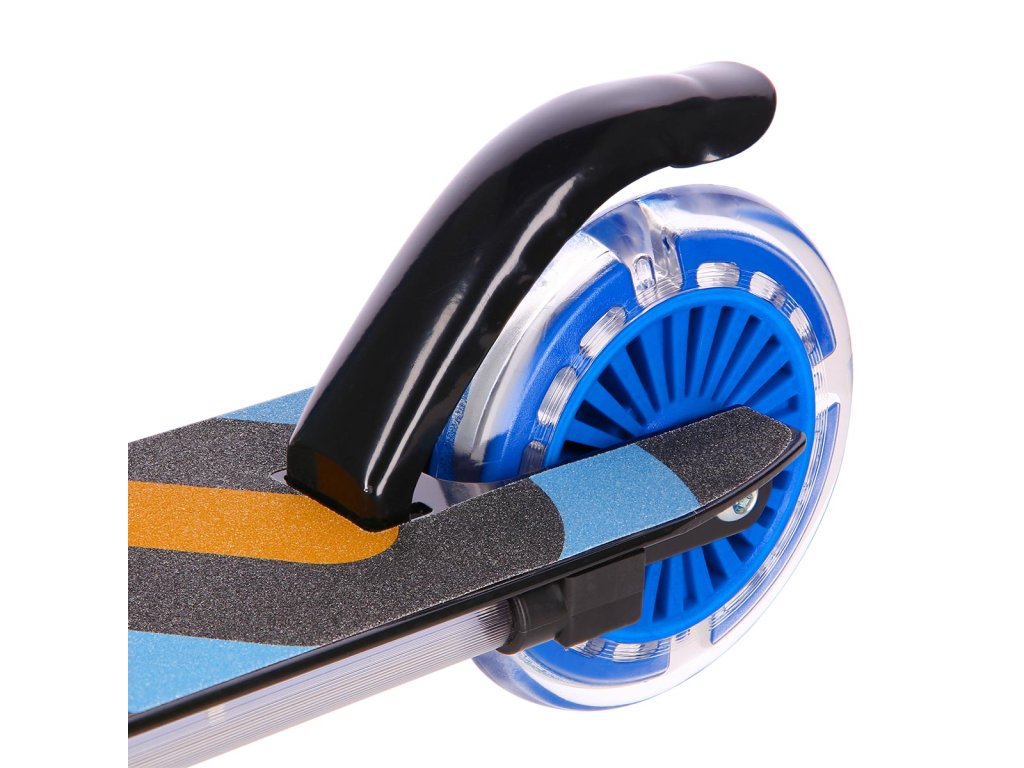 Kolečka o průměru 125 milimetrů jsou osazena barevnými LED diodami, ty slouží jako zajímavý, vizuální prvek, zvyšují zájem dětí a v neposlední řadě zvyšují viditelnost koloběžky například za šera. Kolečka svítí automaticky během jejich otáčení. Dále jsou kolečka osazeny ložisky ABEC 5 pro pohodovou jízdu. Zadní blatník slouží jako nášlapná brzda pro bezpečné zastavení koloběžky.