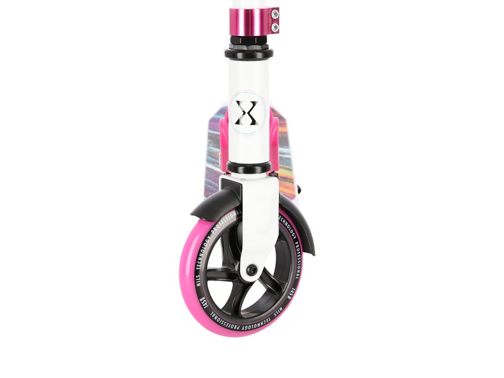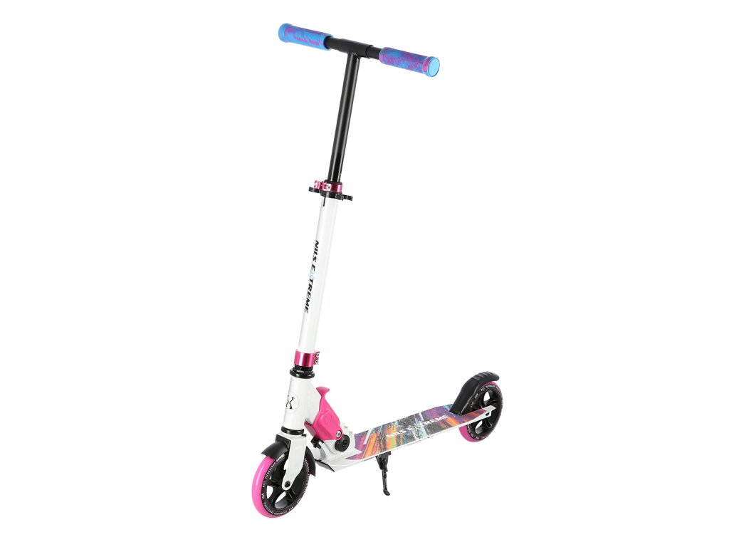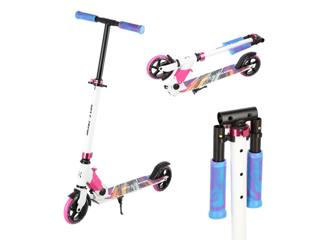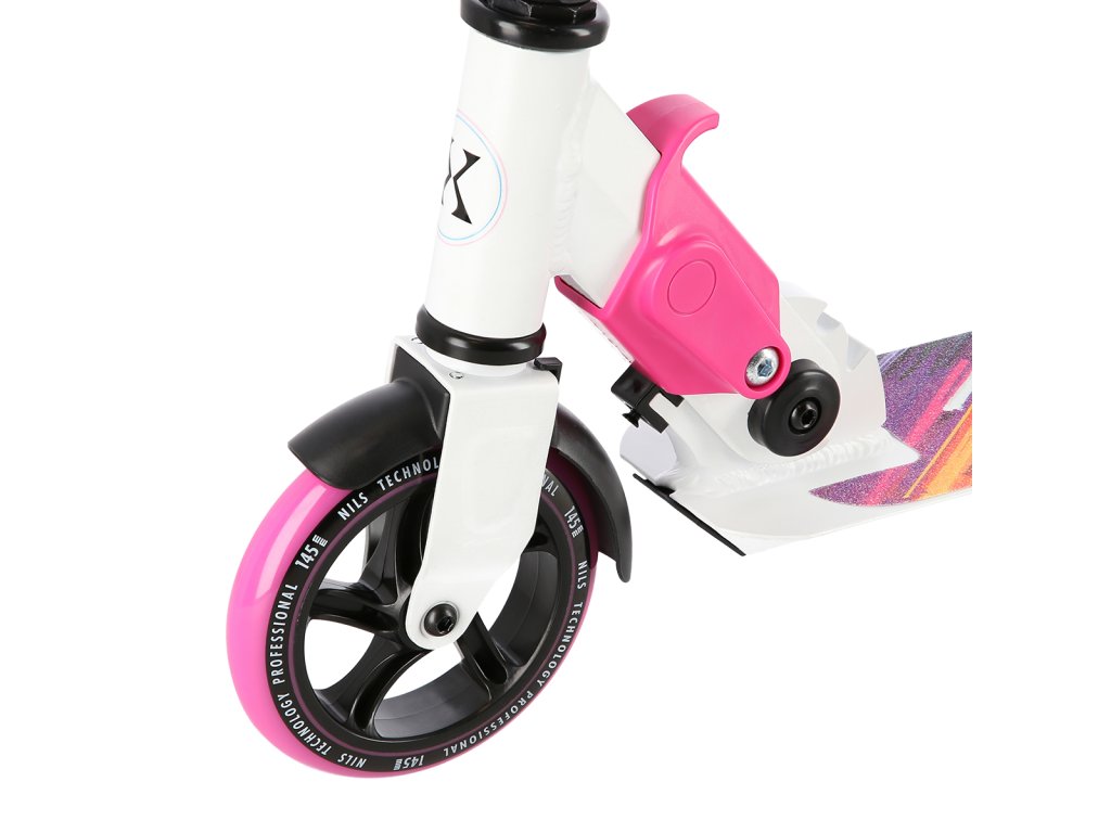 Skládací koloběžka NILS Extreme HD541 je určená především pro děti a dorost. Hlavní předností tohoto modelu jsou polyuretanová kolečka o průměru 145 milimetrů, které zaručují pohodlnou jízdu. Koloběžku lze složit, takže při uskladnění nezabírá mnoho místa a zároveň si ji můžete brát téměř kamkoliv sebou ať už jedete na výlet například vlakem a nebo pokud jedete autem na dovolenou do zahraničí. Dalšími výraznými prvky jsou protiskluzová nášlapná plocha, gumová madla a zadní přítlačná brzda. Klademe důraz především na atraktivní vzhled a kvalitní provedení, díky kterému máte jistotu, že kupujete kvalitní koloběžku jenž potěší a zároveň i ochrání. Chcete-li pro bezpečnost udělat maximum, nezapomeňte se porozhlédnout po přilbě a chráničích.