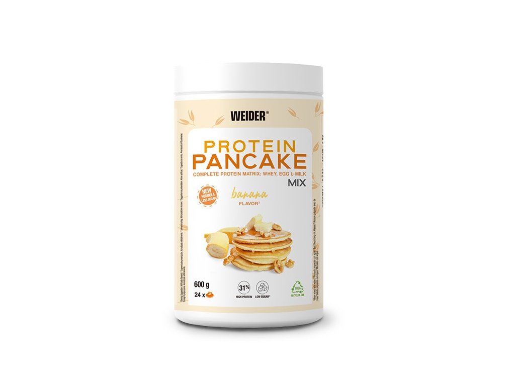 PROTEIN PANCAKE:doplněk stravy. Prášková směs z ovesné mouky se zvýšeným podílem bílkovin (syrovátkových, vaječných a mléčných)pro přípravu palačinek.S cukrem a sladidly.Obsahuje vyvážený poměr proteiny/sacharidy.Bílkoviny přispívají k růstu a udržení svalové hmoty.Doplněk nenahrazuje vyváženou a různorodou stravu,která je pro správné fungování organismu nezbytně důležitá. Doporučená příprava:smíchejte v shakeru 50g produktu(2plné odměrky)se 100ml polotučného mlé-ka(1,5% tuku)nebo vody a promíchejte. Nechte pár sekund odstát. Poté vlejte směs na rozpálenou pánev s trochou kvalitního oleje. V mikrovlnné troubě „pečte“ směs cca 1,5 minut při plném výkonu (800Wattů).1porce=2palačinky.Nepodávejte malým dětem. Po otevření co nejdříve spotřebujte. Produkt není určen k dlouhodobému užívání.Chraňte před vlhkem.Chraňte před malými dětmi. Pro sportovce s vysokými nároky na kvalitní bílkovinnou stravu. Vhodné jako přesnídávka, při chuti na sladké. Hlídejte si denní příjem kalorií.Skladujte na chladném, suchém a temném místě.Spotřebujte v nejkratší možné době po otevření.Info o výrobku:e-shop FIT-PRO CZECH s.r.o.,info@fit-pro.cz, www.fit-pro.cz.Složení výrobku:43%celozrnná ovesná mouka,16% syrovátkový koncentrát(z mléka), 12%celá sušená vejce,pšeničná mouka,aroma,4,2%mléčná bílkovina-izolát,3,8%syrovátková bílko-vina(z mléka),sušený vaječný albumin,2%ModCarb™(ovesné otruby,merlík čilský (quinoa),amarant, pohanka,proso),stabilizátor:fosforečnan sodný(E339),kypřící látka: hydrogenuhličitan sodný-jedlá soda(E500);modifikovaný škrob,emulgátor:sojové lecitiny(E322);chlorid sodný,zahušťující látky: gua-rová guma(E412),xanthanová guma(E415),sladidla:acesulfam K(E950),sukralóza(E955).Obsahuje lak-tózu. Výživové složení/nutriční hodnoty:100g/50g s vodou/50g s pol.mlékem:energetická hodnota: 1700kJ/404kcal/850kJ/202kcal/1050kJ/250kcal,tuky:11,1g/5,6g/7,1g,z toho nasycené mastné kyseli-ny:3,2g/1,6g/2,6g,sacharidy:40g/20g/25g,z toho cukr:3,3g/1,6g/6,4g,vláknina:4,1g/2g/2g,bílkoviny: 35g/17g/21g,sůl:2g/1g/1,12g.Alergeny:mléko,vejce,oves,pšenice,soja a jejich deriváty. Příchuť: VA-NILKA.Balení:600g.Distributor/výrobce:WeiderNutrition,S.L.,C/Electrónica39,28923Alcorcón-Madrid (Španělsko).www.weider.es. Minimální trvanlivost do a číslo šarže: dno výrobku. Dovoz/ prodej: FIT-PRO CZECH s.r.o., Jaurisova 515/4, Praha 4, 140 00, Czech Republic.