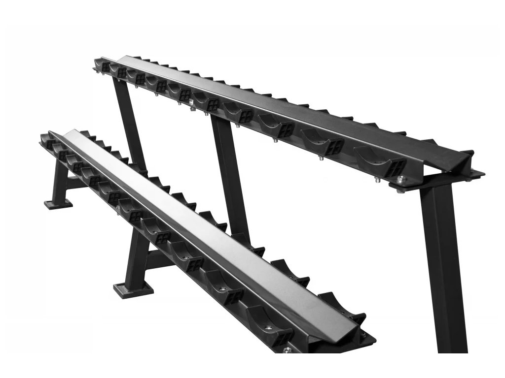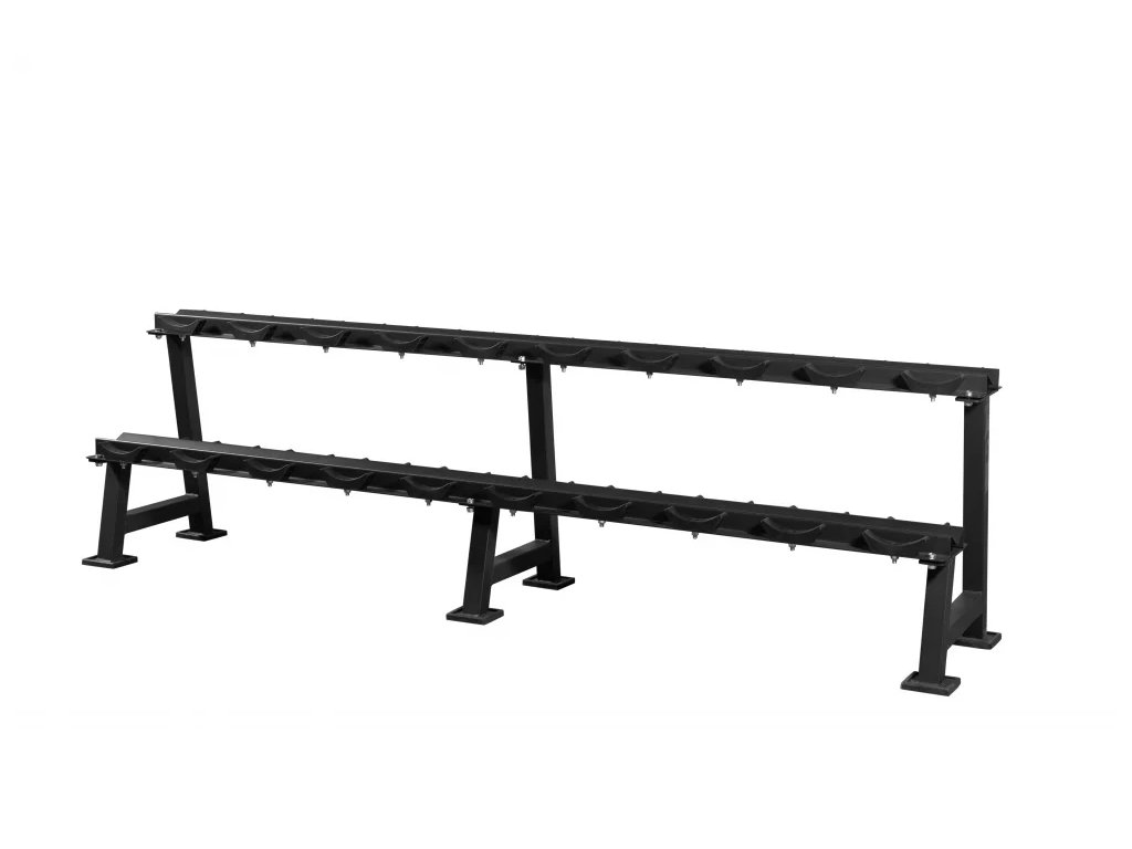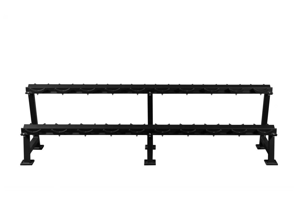 Mějte přehled ve svých kulatých jednoručkách Masivní stojan zajistí dokonalou organizaci kulatých jednoručních činek. Je vyroben z velmi kvalitní oceli o rozměrech profilu rámu 50 x 50 x 1,5 mm. Povrch je pokryt kvalitní práškovou barvou, která chrání stojan před korozí, poškozením a zároveň skvěle vypadá. Součástí konstrukce jsou 2 police, které jsou umístěny nad sebou pro snadnou orientaci mezi činkami. Svými prémiovými vlastnostmi je vhodný jak do fitness center, tak do domácích posiloven. Jednoduchá manipulace s činkou Stojan umožňuje velmi snadný přístup k činkám, a to díky držákům a oceli ve tvaru „V“ mezi držáky na činku. Precizně navržený tvar zaručuje pohodlnou manipulaci s činkou. Už vás nebudou trápit činky zaseknuté ve stojanu. 10 párů činek Dvouřadý stojan disponuje ideálním prostorem pro uložení až 10 párů činek. Každé patro je široké 240 cm a vyrobeno z kvalitní oceli. Nehledejte činky po celé posilovně. Mějte dokonale organizovaný cvičební prostor díky našemu stojanu. Prémiová stabilita Předností stojanu jsou tři podpěrné rámy, které dodávají konstrukci maximální stabilitu a odolnost vůči těžké zátěži. Stojan je vybaven protiskluzovými podložkami, které chrání podlahu před poškozením a výborně tlumí otřesy a vibrace. Zajistí stabilitu na površích, kde je vyžadována. Dokonale tvarované držáky Dumbell Rack je vybaven držáky tvarovanými přesně na uložení kulatých jednoručních činek. Díky tomu se Vám nestane, že by činky ze stojanu spadly. Držáky můžete přimontovat k oceli libovolně podle Vašich potřeb. Jsou vyrobené z vysoce odolného plastu, který odolá i těm nejtěžším jednoručním činkám. Činky se o sebe nebudou třít, tudíž jsou chráněny před poškozením. Kompaktní rozměry Ušetřete spoustu místa a zároveň mějte dokonale organizovanou posilovnu. Rozměry celé konstrukce jsou 54 x 244 x 74,4 cm (D x Š x V). Šířka jedné police je přibližně 24 cm. Stojan je perfektním doplňkem do každé posilovny. Můžete ho umístit přesně tam, kam potřebujete. Maximální zatížení 680 kg Prémiová nosnost stojanu je důkazem kvalitního zpracování s důrazem na detail. Díky vysoké nosnosti stojan bez problému zvládne i těžké činky pro ty nejsilnější sportovce. Hlavní výhody stojanu na kulaté jednoruční činky: robustní konstrukce z kvalitní oceli prémiová nosnost 680 kg organizovaný cvičební prostor jednoduchá manipulace s činkami protiskluzové podložky vhodný do všech fitness center i domácích posiloven uložení až 20 činek dokonale tvarované držáky na jednoruční činky kvalitní povrchová úprava – prášková barva 100% garance spokojenosti Veškeré zakoupené zboží můžete do 30 dnů zdarma vrátit bez udání důvodu. To znamená, že zboží, které chcete vrátit, u Vás zdarma vyzvedneme a peníze Vám vrátíme na Vámi zvolený účet do 2 pracovních dnů po navrácení zboží. Stačí nám napsat na info@truesteel.eu nebo zavolat na +420 777670947. Vrácení zboží má 2 podmínky - zboží musíte řádně zabalit, aby se při přepravě nepoškodilo a zakoupené zboží nesmí být poškozené. Garance slouží k prohlédnutí zboží, ne k jeho opakovanému použití.Doplňkové parametry