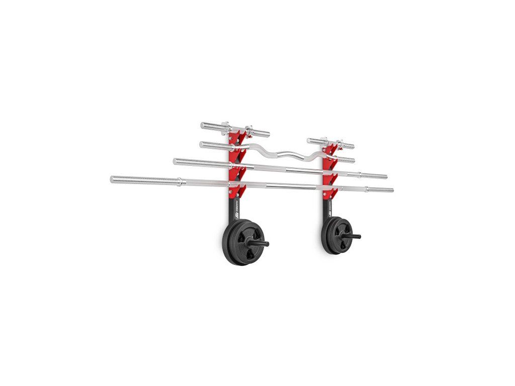 Konstrukčně jde o 2 kusy ocelových profilů určených k montáži na zeď, kdy se každý profil připevní pomocí 4 kotev. Kotvící materiál není součástí dodávky a je nutné zvolit vhodný druh podle materiálu zdi. Po montáži získáme 4 páry držáků na osy a 2 trny pro odkládání závaží. Do držáku tedy můžeme odložit až 4 obouruční osy a nebo až 8 jednoručních hřídelí. Trny pro odkládání závaží mají délku 21 centimetrů a průměr 2,5 centimetru.