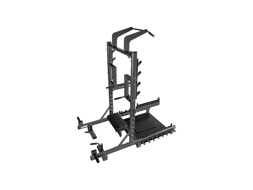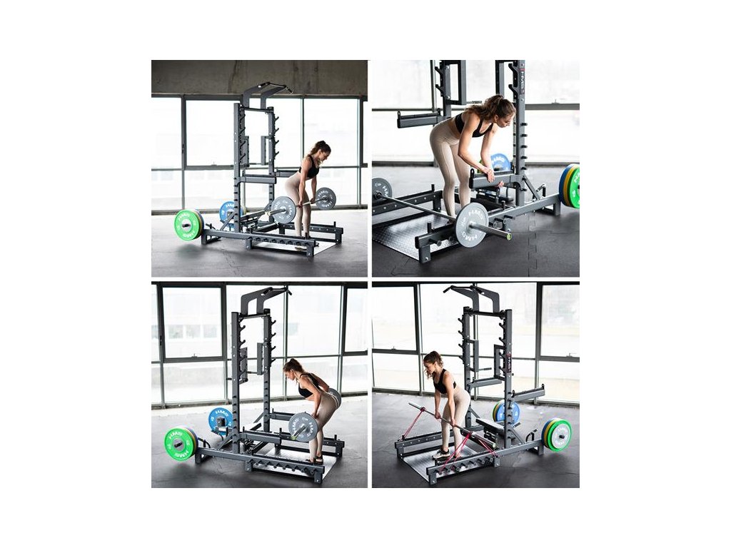 Díky úchytům na činku a pevným bezpečnostním zarážkám poskytuje SMP01 komfortní a bezpečné provádění dřepů s činkou a dalších cviků s těžkými váhami. Navíc dva trny na skladování kotoučů umožňují snadnou organizaci vybavení ve vaší tréninkové zóně.