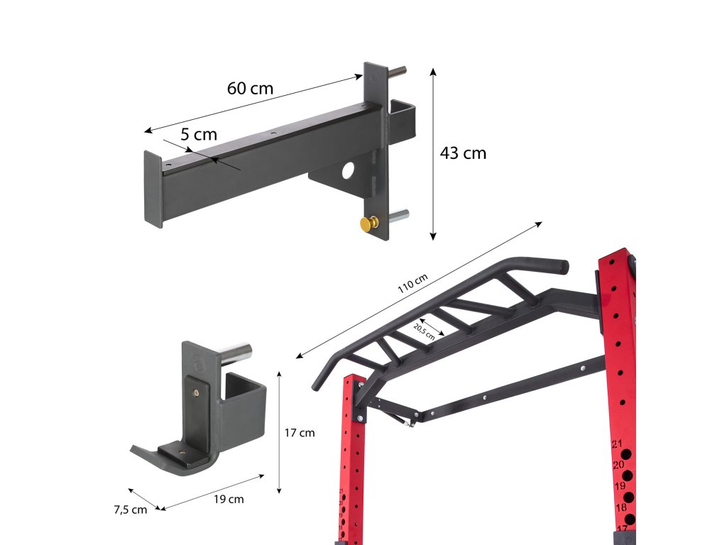 Rack má multifunkční hrazdu na přítahy, která vám díky různým možnostem úchopu umožní rozvíjet zádové, ramenní a prsní svaly. Shyby jsou jedním z nejlepších cviků pro horní část těla, protože zapojují více svalových skupin a zlepšují pohyblivost kloubů. Chcete-li si toto cvičení zjednodušit, stačí použít speciální odporové gumy. Na KLT23 najdete také dva háky na osu, které můžete upevnit v libovolné výšce.